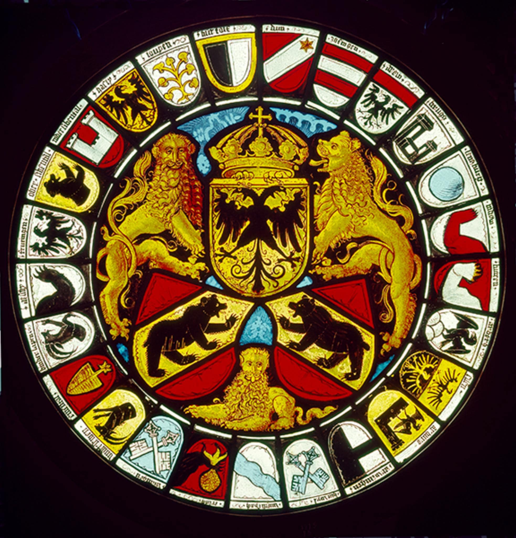Namen Ämterwappen im Uhrzeigersinn: dun, zofingen, arow, brugg, lentzburg, nidow, burren, arberg, ellen, arburg, arwangen, hutwyl (falsch bezeichnet für Wangen), wietlispach, erlach, wangen (falsch bezeichnet für Huttwil), vndersewen, emental (für Trachselwald), hinderlapen, aeschy, frutingen, ober sibental, nider sibental, hasly, loupen, burtolf.