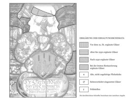 Mehrere Gläser im Scheibenoberteil sowie das Glas mit der Pfeilerbasis am rechten Rand neu ergänzt (das Foto 9821 des SNM Zürich zeigt an Stelle der heutigen Ergänzungen z. T. alte Flickstücke und an Stelle der erneuerten Pfeilerbasis einen Ausbruch); Sprünge und zahlreiche Sprungbleie; die Verbleiung erneuert.