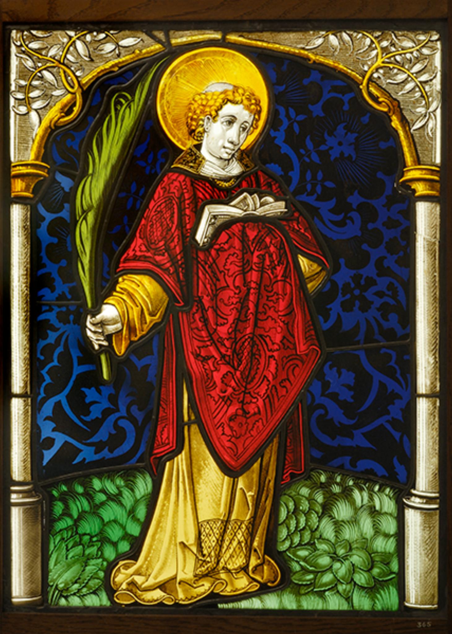 Der vor blauem Damastgrund auf grünem Rasengrund stehende hl. Vinzenz ist als Diakon in ein gelbes Untergewand (Alba) und eine rote Dalmatika gekleidet. In seinen Händen hält er die ihn auszeichnenden Attribute, Palmzweig und Buch. Er erscheint in einer schlichten Säulenrahmung, die ein spärlich mit Blattwerk besetzter Astbogen krönt.