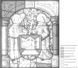 Das Bogenfeld oben links, der rechte Rundpfeiler und ein Stück im Fliesenboden neu ergänzt. Von den blau damaszierten Gläsern stimmen das grosse unterhalb der Jahreszahl und die beiden unten angrenzenden zu Seiten des Kruzifixes im Muster nicht überein. Weil sie alle aus altem Glas sind, lässt sich allerdings nicht bestimmen, welches oder welche davon alt ergänzt ist/sind. Teilweise geringe Schwarzlotverluste; mehrere Sprungbleie; die Verbleiung erneuert.