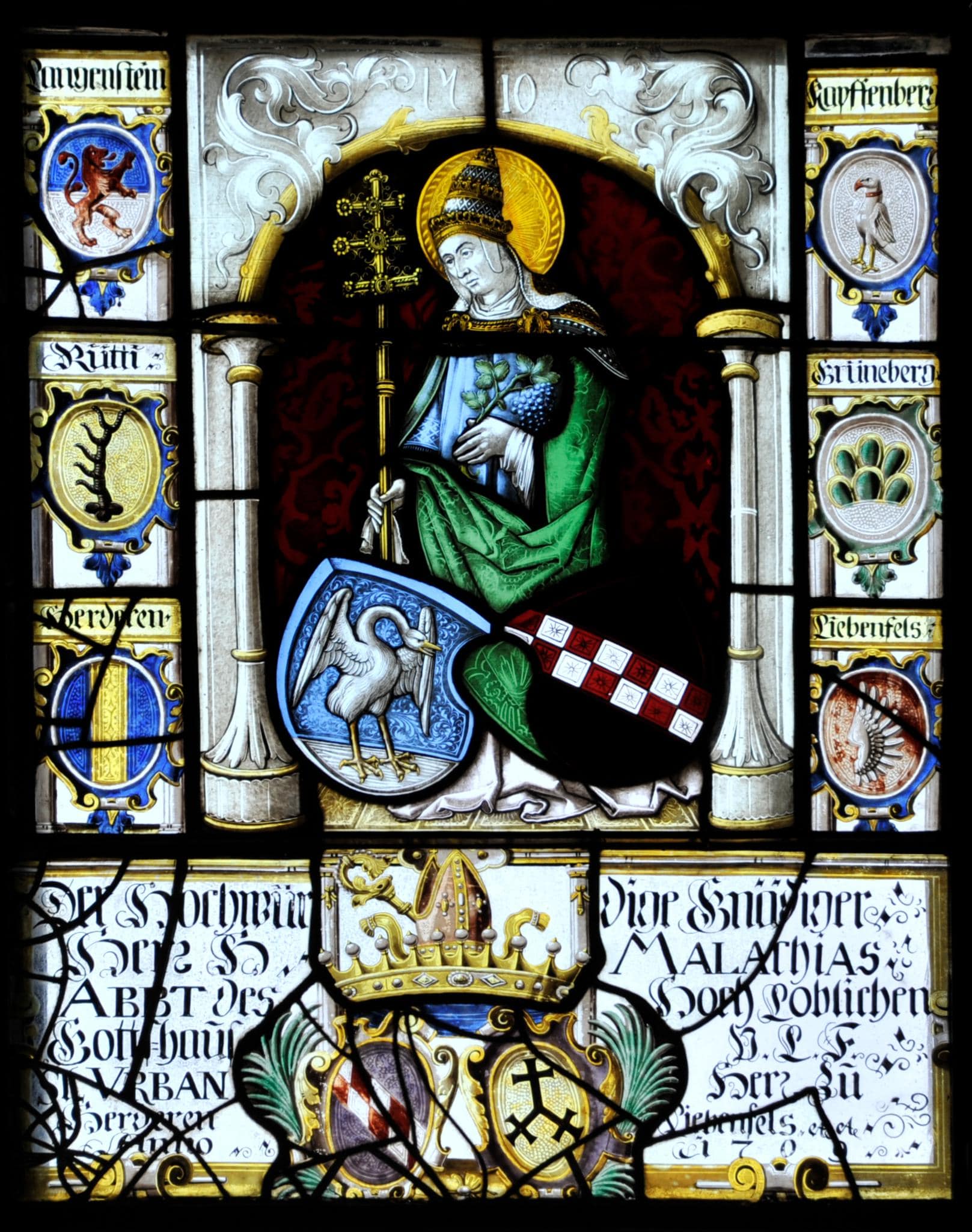 Das Glasgemälde enthält im Zentrum Hans Drenckhahns neuzeitliche Kopie der zu Beginn des 16. Jahrhunderts vom St. Urbaner Abt Johannes VII. Renzlinger (1501–1512) in die Kirche Melchnau gestifteten Scheibe (das Original davon heute im BHM Bern, Inv. 8040). Dargestellt ist in dieser Figurenscheibe der unter einem blattgeschmückten Astbogen vor rotem Damastgrund stehende hl. Papst Urban. Er hält in seiner linken Hand ein Traubenbündel, denn der Zusammenfall seines Heiligenfestes mit dem Ende der Frühjahrsarbeiten in den Weingärten machte ihn zum Patron der Winzer. Sein Attribut wurde ihm auch aufgrund der Verwechslung mit dem hl. Bischof von Autun und Langres beigegeben, der am gleichen Tag verehrt wird und sich laut Legende vor seinen Verfolgern hinter einem Weinstock verbarg. Zu Füssen von Papst Urban I. sind die Wappenschilde des Abtes Johannes VII. Renzlinger (1501–1512) und des Mutterklosters Cîteaux platziert. Malachias Glutz hat in seine Nachstiftung von 1709 Renzlingers Scheibe integriert, indem er sie seitlich und unten streifenförmig erweiterte. Die 1709 angefügte breite Fusszone besteht aus der Stifterinschrift und den beiden in Rollwerkkartuschen gesetzten Wappen des Zisterzienserordens und des Abtes Malachias Glutz. Diese beiden Wappenschilde werden von zwei Palmwedeln umkränzt und von einer grossen Fürstenkrone überhöht, aus der Inful und Abtstab herausragen. Die seitlichen Anfügungen zeigen in blauen Kartuschen die namentlich bezeichneten Wappen von Langenstein, Rütti und Herdern (links) sowie von Kapfenberg, Grünenberg und Liebenfels (rechts). Das erstgenannte Wappen bezieht sich auf Ulrich von Langenstein, der mit seinen Brüdern zu den ältesten Wohltätern von St. Urban zählte (er wurde dort begraben). Ihre Burgen Langenstein und Grünenberg bei Melchnau sind in Ruinen noch vorhanden. Ihre Wappen wurden später in dasjenige des Klosters aufgenommen. Diese zwei Wappen sind auf der Scheibe ebenso präsent wie jenes des Arnolf von Kapfenberg, einem Schwager der genannten Brüder, der dem Kloster den Bauplatz für eine neue Gründung geschenkt haben soll. Die Wappen von Liebenfels und Herdern erinnern an die zwei gleichnamigen Herrschaften in der Nähe Frauenfelds (TG), die 1654 bzw. 1683 an das Kloster St. Urban kamen.