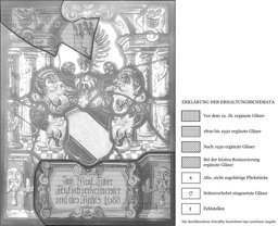 Die Schrifttafel und das Postament rechts daneben sowie ein Teil der Helmzier und das Glas in der Ecke oben links neu ergänzt; einige Sprünge und mehrere Sprungbleie; die Verbleiung erneuert. Das Foto des SNM Zürich zeigt an Stelle der Inschrift und des Postaments rechts eine grosse Lücke sowie weniger Sprungbleie als heute.