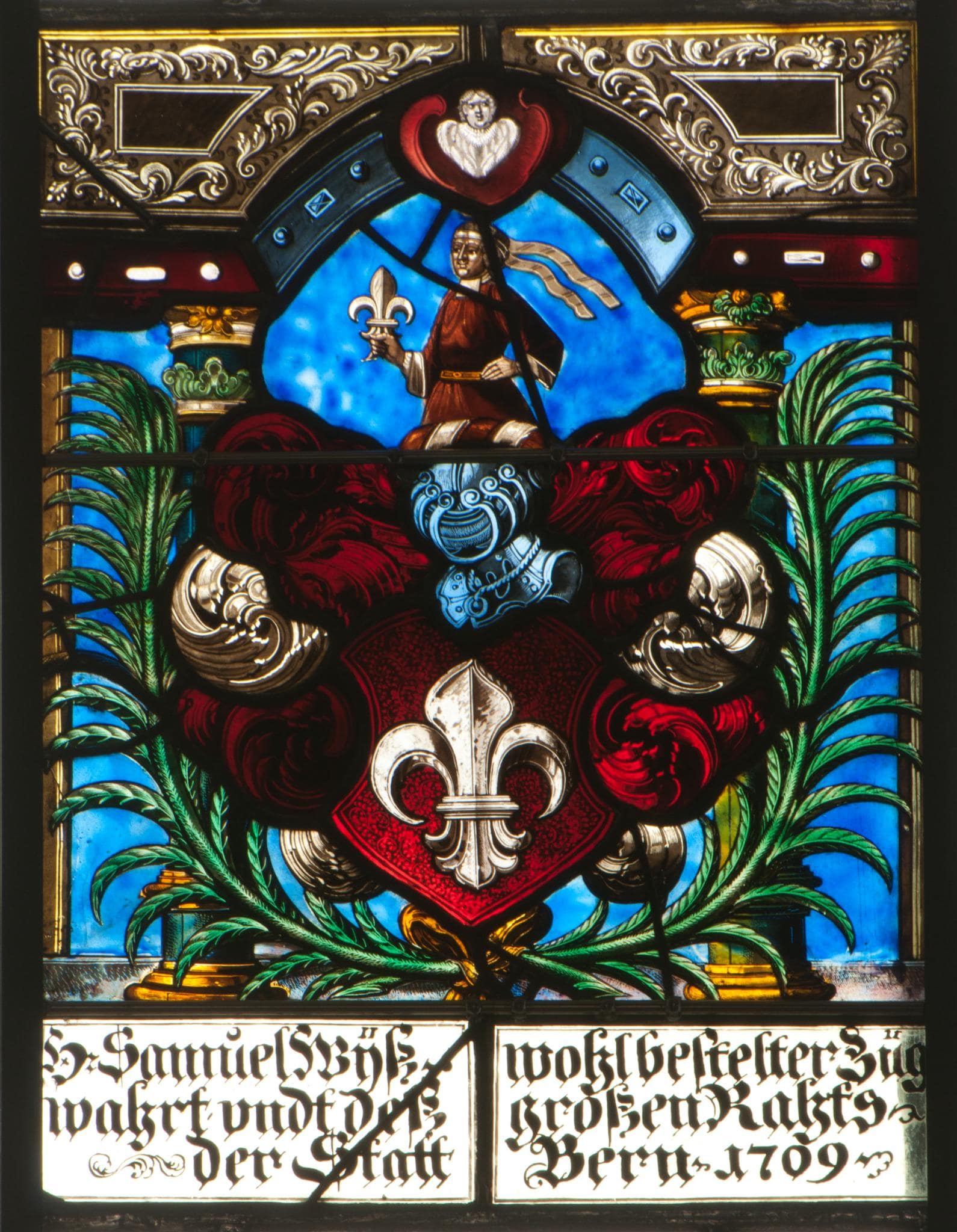 Vor wolkig-blauem Grund steht das von zwei grünen Palmzweigen umkränzte Vollwappen des Samuel Wyss. Dahinter erhebt sich eine dreiachsige Architektur aus blauen Innensäulen und einem eingezogenen Bogen, dessen rote Scheitelkartusche eine Engelsbüste schmückt. Am Scheibenfuss nimmt die Stifterinschrift die ganze Scheibenbreite ein.
