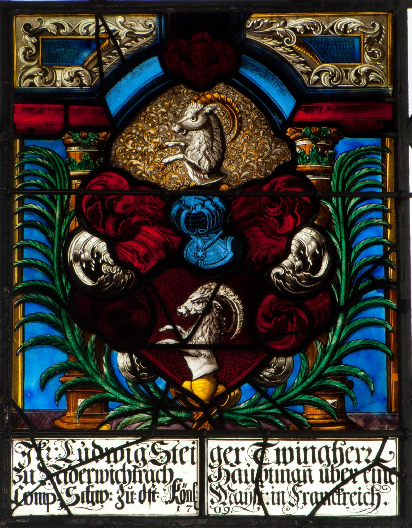 Vor blauem Grund steht das von zwei grünen Palmzweigen umkränzte Vollwappen Ludwig Steigers. Der Grund um die Helmzier hebt sich bei dieser Scheibe durch seine feine, rostbraune Damaszierung ab. Hinter dem Wappenschild erhebt sich eine dreiachsige Architektur aus rostbraunen Innensäulen und einem eingezogenen Bogen, dessen dunkelrote Scheitelkartusche ein Engelskopf schmückt. Der Scheibenfuss nimmt die Stifterinschrift auf.