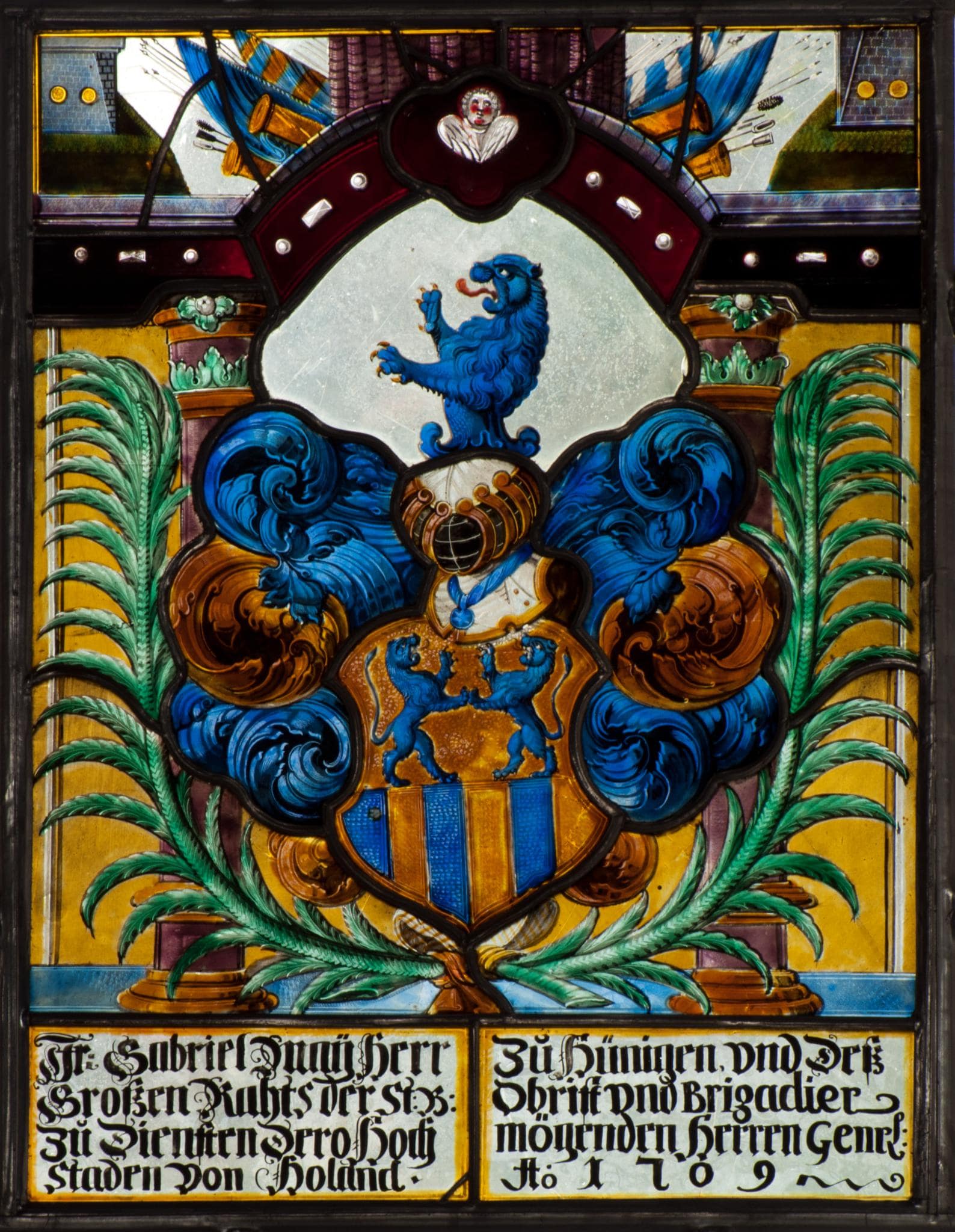Jr. Gabriel Maÿ Herr zů Hünigen vnd Deß / Großen Rahts der St: B: Obrist vnd Brigadier / zů Diensten dero hoch mögenden Herren Genel: / staden von Holand Ao 1709.