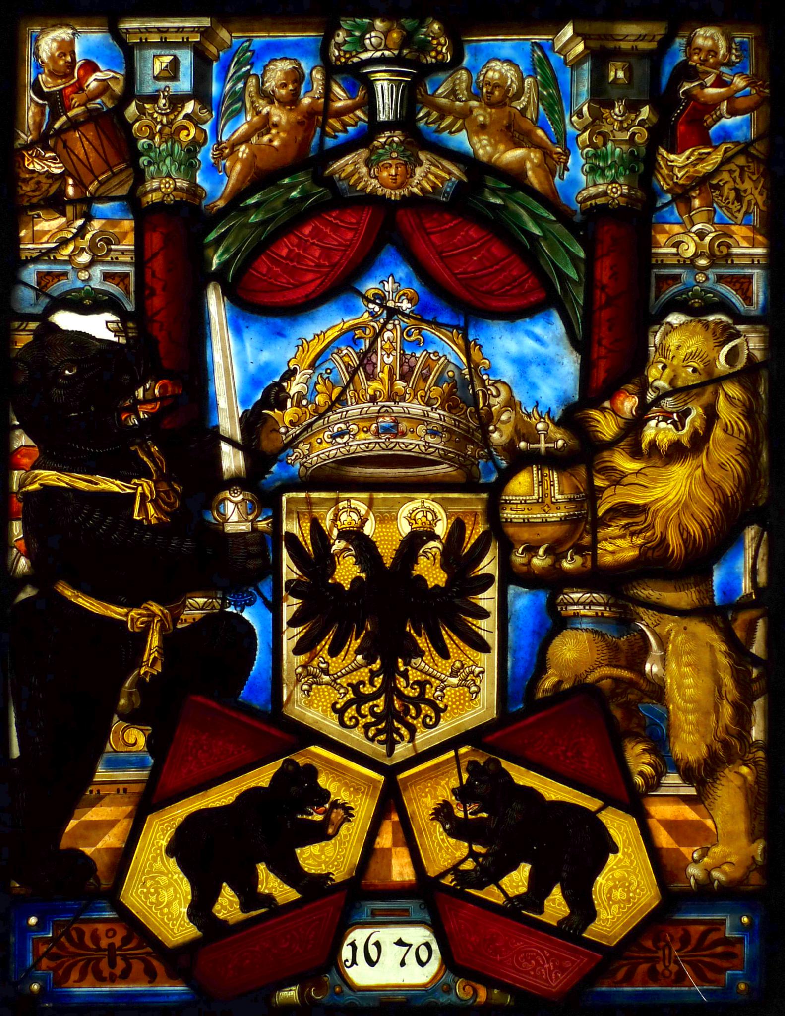 Die Bernscheibe von 1670 sahen Franz Thormann und Wolfgang Friedrich von Mülinen 1896 im Südfenster der Chor-Ostwand.