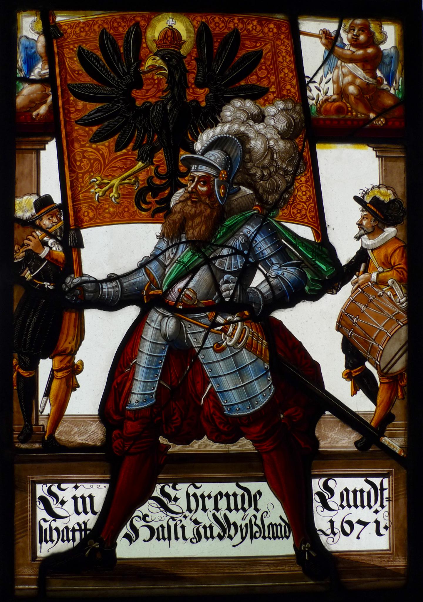 Der Bannerträger von Hasli ist breitbeinig vor dem die Stifterinschrift enthaltenden Podium postiert. Er ist in einen Halbharnisch, einen federgeschmückten Helm sowie rote Pluderhosen und Strümpfe gekleidet und mit Schwert, Schweizerdolch und einer um die Brust gebundenen grünen Schärpe ausgestattet. Begleitet wird er von zwei vor farblosem Grund auf dem Podium stehenden Musikanten, einem Trommler und Pfeifer. Hinter diesen erheben sich die ein rotes Gebälk tragenden Rahmenpfeiler. Auf dem Gebälk haben sich zwei Putten niedergelassen. Das Glasgemälde ist analog komponiert wie die Landschaftsscheibe Interlakens und die Stadtscheibe Unterseens.