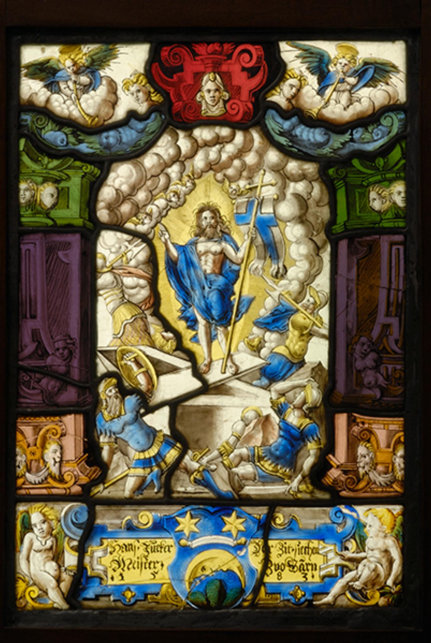 Im Mittelbild ist die Auferstehung Christi dargestellt. Der in einen blauen Mantel gehüllte Heiland steht, die Kreuzfahne in der Linken und mit segnender Rechten, auf dem offenen Grab. Die ihn umgebende Lichtgloriole blendet die erwachenden Grabwächter, die sich abwenden oder in abwehrender Haltung aufblicken. Die reich mit Figuren dekorierte Rahmung besteht aus breiten violetten Pilastern mit vorgelagerten Balustersäulen. Darauf ruht ein geschweifter, aus Hermenfiguren gebildeter blauer Bogen, der in einer roten, kopfgeschmückten Rollwerkkartusche endet. Zu deren Seiten ist, in Wolken eingebettet, je ein Horn blasender Engel zu sehen. Das Stifterwappen ist als zentrales Element am Scheibenfuss festgehalten. Es ist der blauen Inschriftenkartusche aufgesetzt, die von zwei sitzenden Putten gehalten wird.