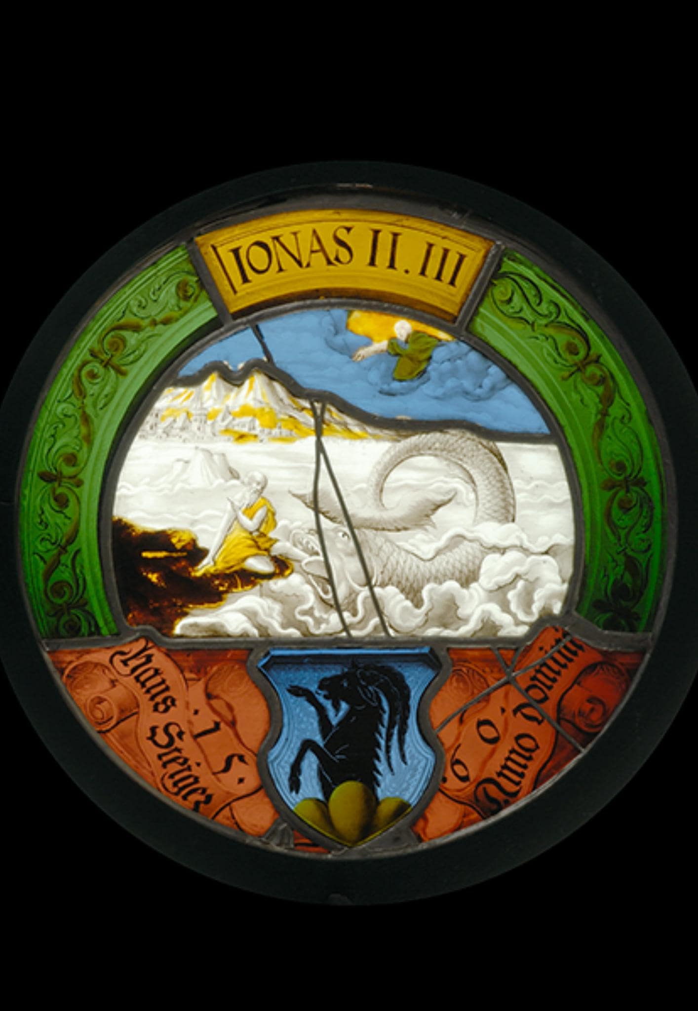 Die zentrale Figurenszene zeigt den am Ufer sitzenden Propheten Jona neben dem sich elegant im schäumend weissen Meer krümmenden Fisch, von dem er an Land gespieen wurde. Im Hintergrund erscheint eine am Meeresufer gelegene Stadt vor hohen Bergen und darüber im Himmel der das Geschehen beobachtende Gottvater. Die Szene umfasst eine grüne Bordüre mit Blattwerk, der oben eine gelbe Tafel mit Verweis auf das die hier dargestellte Geschichte schildernde Buch Jona (Jon 2) eingefügt ist. Das untere Scheibendrittel füllt das Wappen Hans Steigers und die Schriftrolle mit dessen Namen.