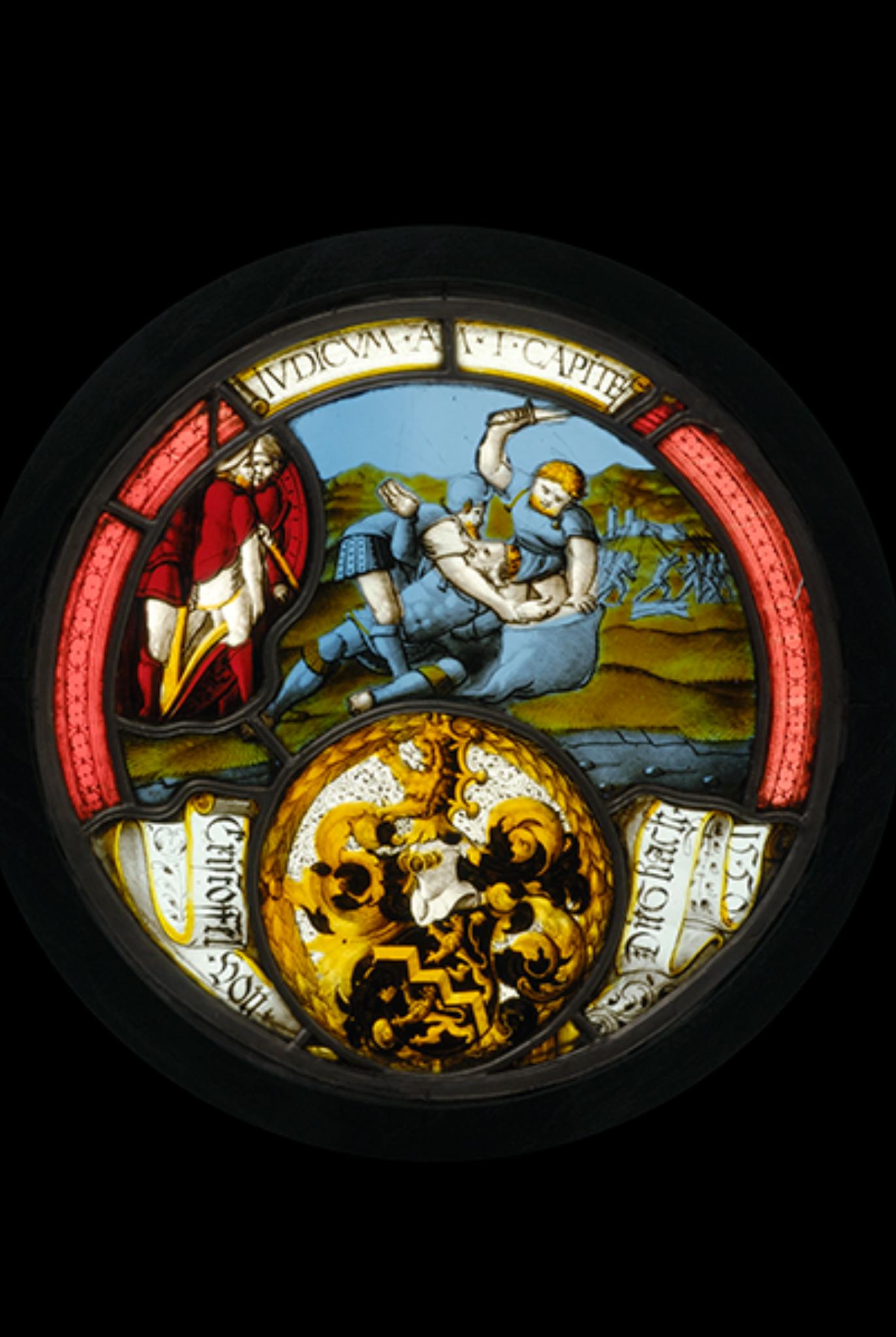 In der oberen Hälfte der Rundscheibe ist die Verstümmelung des Kanaanitischen Königs Adoni-Besek durch die Israeliten festgehalten. Die rahmende Ornamentbordüre nimmt im Scheitel die Nennung der Bibelstelle auf (Ri 1). Die untere Hälfte füllt das umkränzte, von der Banderole mit dem Stifternamen umflatterte Vollwappen Christoph von Diesbachs.