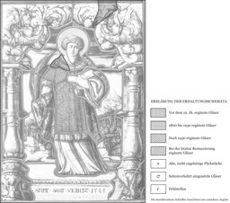 Zwei kleine neue Ergänzungen; stellenweise Verluste in der Schwarzlotbemalung; Sprungbleie; die Verbleiung erneuert.