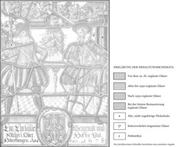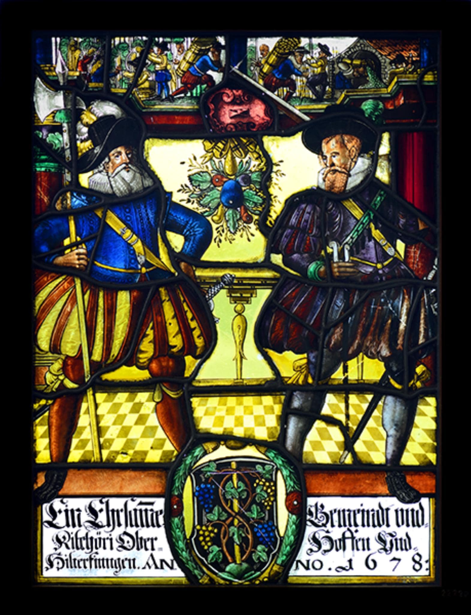 Das oval umkränzte gemeinsame Wappen Oberhofens und Hilterfingens erhebt sich vor dem beschrifteten Podium. Darüber sind vor einer gelben Balustrade und gelbem Grund ein Halbartier und ein Büchsenschütze postiert. Weil sie ihre Füsse vor und nicht auf dem grau und gelb gefliesten Boden des Podiums abgesetzt haben, sind sie räumlich nicht klar positioniert. Die beiden bärtigen, schwertbewaffneten Schildbegleiter tragen einen schwarzen Federhut sowie Wams, Hemd und Pluderhosen in den Farben Blau, Gelb und Rot bzw. Violett und Rot. Während der Schütze seine Büchse geschultert hat und sich mit der Rechten auf die Gewehrgabel stützt, hält sein Kollege in der Rechten die Halbarte. Umfasst werden die beiden Männer von einer schlichten Architekturrahmung aus roten Säulen und einem roten Gebälk, an dessen Mittelkartusche ein Fruchtbouquet aufgehängt ist. Das Oberbild zeigt Bauern bei der Traubenernte im Weinberg und beim Keltern der Trauben, d. h. es schildert den Weinbau, einen der damals wichtigsten Arbeitszweige der Einwohner Oberhofens und Hilterfingens.