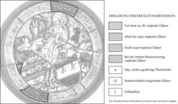 Zwei Gläser der Bordüre und ein kleines Helmdeckenstück neu ergänzt; Sprungbleie; die Verbleiung erneuert.