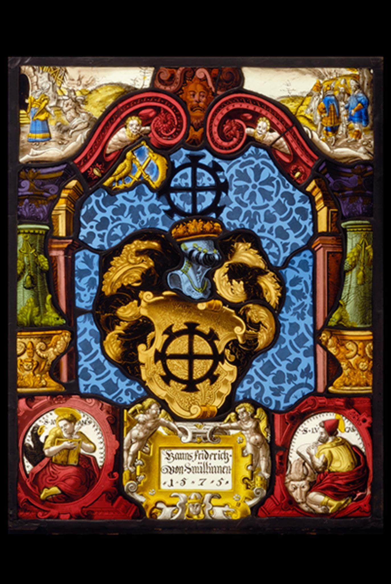 Im Zentrum erscheint vor blauem Damastgrund das Vollwappen des Hans Friedrich von Mülinen. Neben seiner Helmzier ist diesem oben links das Ordensemblem vom Fisch und Falken beigefügt. Den Wappenschild umfasst eine schmuckvolle, zweischichtige Renaissance-Architektur aus rosa Pfeilern und grün-gelben Balustersäulen. Darauf fusst ein roter Volutenbogen, der mit zwei bärtigen Männern und am Scheitel mit einer Löwenmaske bestückt ist. In den beiden oberen Zwickelfeldern wird die Leidensgeschichte Hiobs geschildert. Zu sehen sind links der von Schwären befallene Hiob und seine Frau vor dem zerstörten Haus und rechts seine Freunde. Die gelbe Rollwerktafel mit der Stifterinschrift am Scheibenfuss ist mit zwei Putten besetzt. Zu ihren Seiten befinden sich in ovalen roten Rollwerkmedaillons der hl. Johannes Evangelist mit dem Adler sowie der hl. Lukas mit dem Stier.