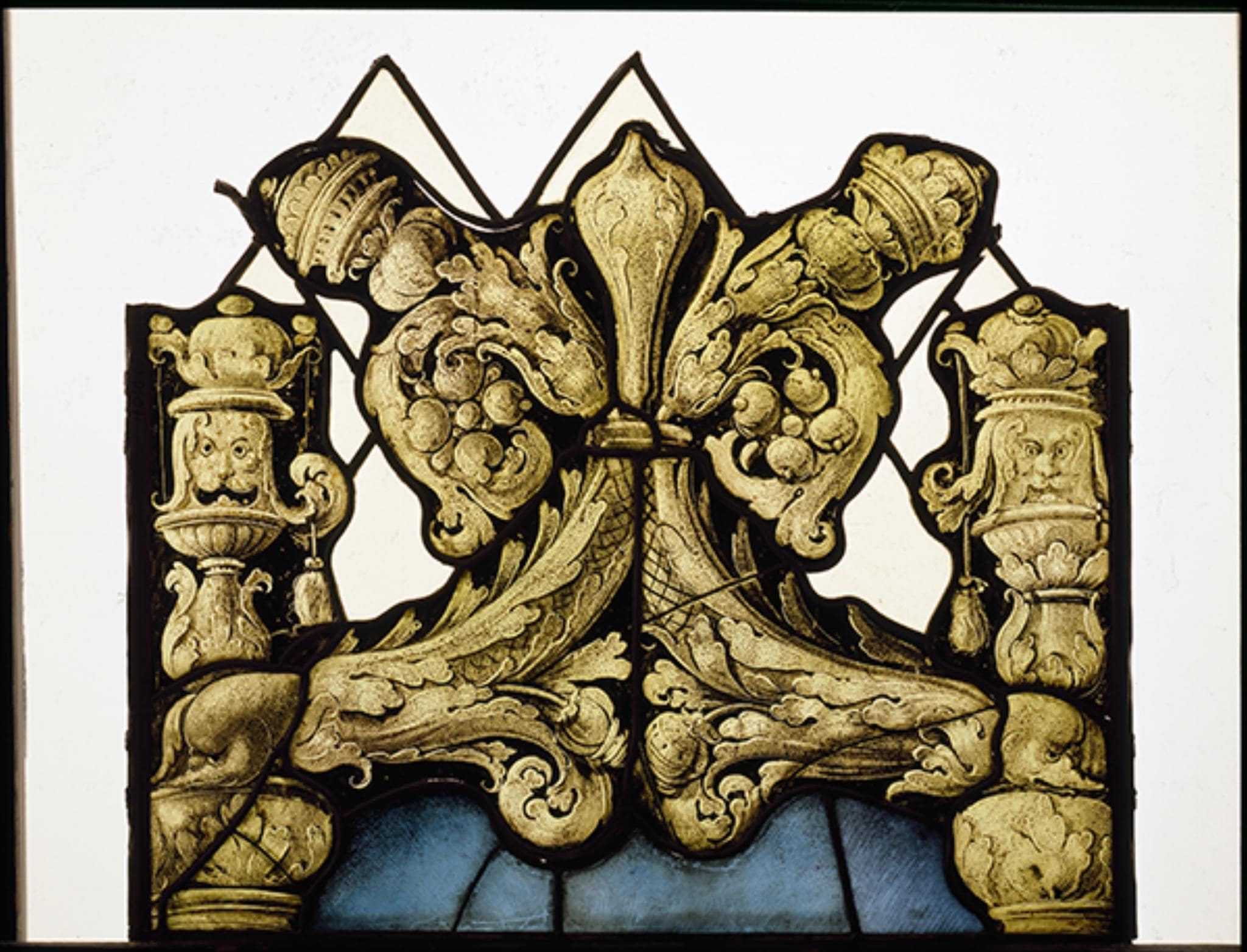 Das herausgelöste Fragment eines Glasgemäldes stellt eine in Steinfarben wiedergegebene Architekturbekrönung dar. Zwei rahmende Kandelaber mit Löwenmasken und Delphinköpfen schliessen einen Blattwerkbogen mit Fruchtwerk und Kronenaufsätzen ein.