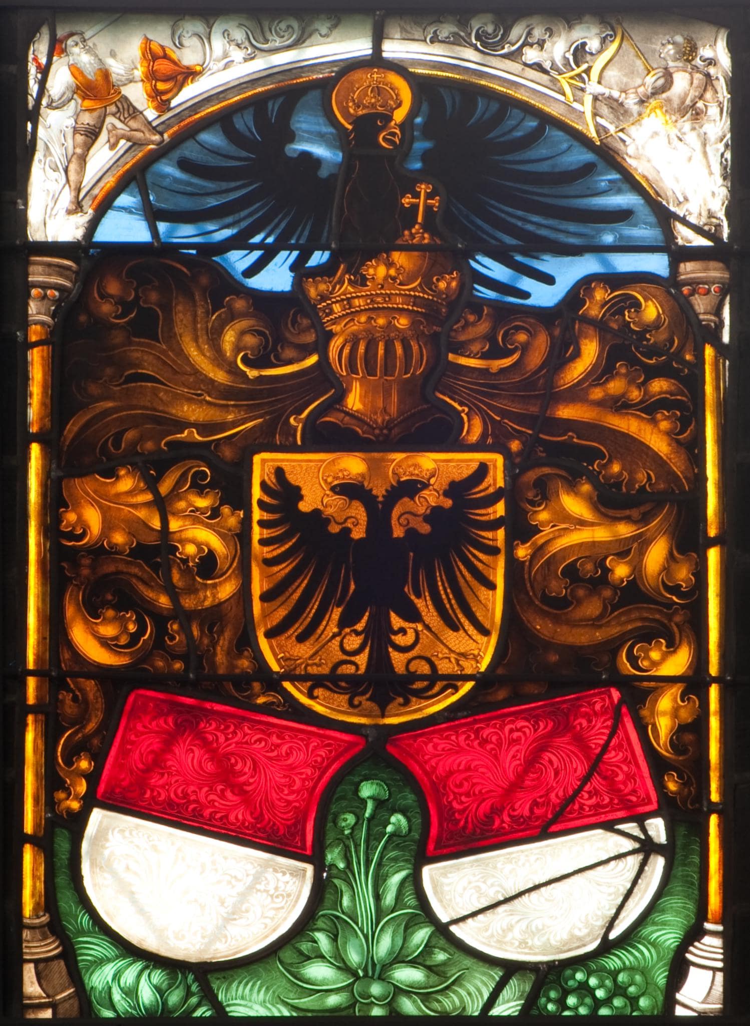 Farbloses und farbiges Glas; Bemalung mit Schwarzlot, Silbergelb und Eisenrot.