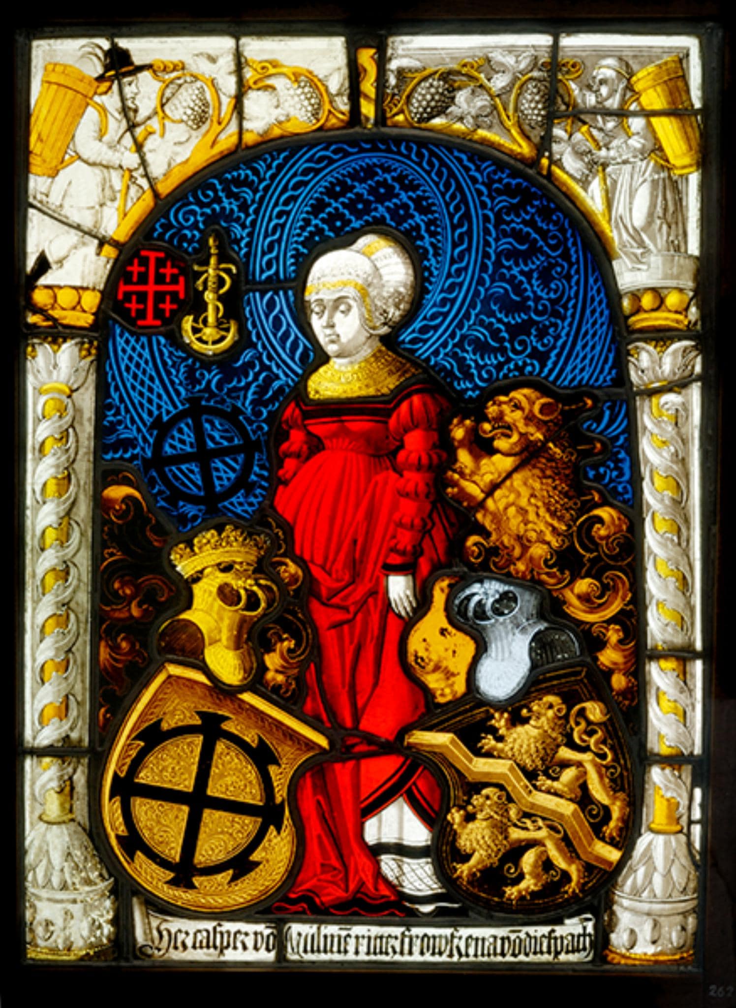Vor blauem Damastgrund sind die Vollwappen des Kaspar von Mülinen und der Verena von Diesbach dargestellt. Über der Helmzier des Von-Mülinen-Wappens befinden sich die Embleme des Ordens vom hl. Grab und der hl. Katharina. Zwischen beiden Schilden steht eine vornehme Patrizierin in rotem Gewand und mit einer weissen Haube auf dem Kopf. Die seitliche Umrahmung bilden zwei vor schlanke Pfeiler gesetzte gelbe Stämmchen, die von einem Band umschlungen werden und einen gelben Astbogen tragen. Aus diesem wächst Rankenwerk mit Trauben, die von einem Winzer und einer Winzerin mit grossen Tausen am Rücken gepflückt werden. Unterhalb der beiden Wappen ist der Stiftername auf einer Schriftrolle festgehalten.