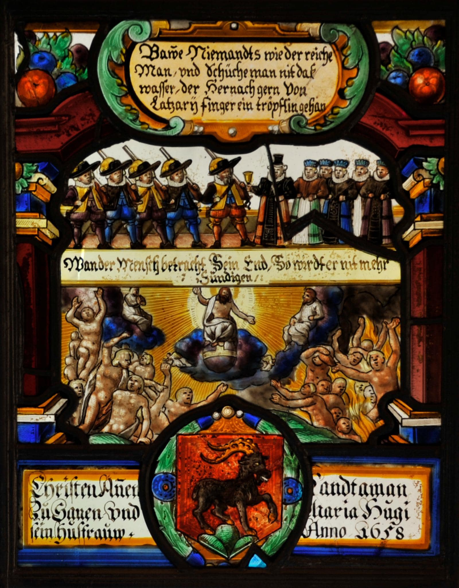 Das zentrale Motiv der Scheibe bildet das Jüngste Gericht. Bei dieser Darstellung liess sich Matthias Zwirn durch den Kupferstich von Matthäus Merians Bilderbibel (Illustration zu Matth. 25, 31–46) inspirieren. Allerdings kopierte er Merians Stich nicht wortwörtlich, vielmehr entnahm er daraus Teilmotive, die er mehr oder weniger abwandelte. Zu sehen ist Christus als Weltenrichter, der über den Seligen und Verdammten in einer Strahlenglorie auf der wolkenumhüllten Erdkugel thront. Darüber erscheint, durch ein Spruchband abgesetzt, die elfköpfige Stifterfamilie. In der Mitte stehen Christian Annen mit geschulterter Büchse und seine ihm den Becher zum Willkomm reichende Gemahlin. Daneben sind links die vier Söhne ebenfalls in Schützentracht sowie rechts die fünf Töchter aufgereiht. Die ganze Figurenkomposition umschliesst eine rote Bogenarkade, deren Scheitel eine grosse Rollwerkkartusche mit einem Sinnspruch ziert. Den Scheibenfuss füllt die Stifterinschrift mit dem ihr zentral vorgesetzten, oval umkränzten Wappen Christian Annens.