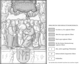 Vor blauem Grund sind im Hauptbild die um ihren Herren versammelten Jünger festgehalten. Unter ihnen sticht durch seinen roten kurzärmeligen Mantel der links neben Christus stehende Petrus hervor. Der Herr, der in einem lila Mantel inmitten der Apostel sitzt, zeigt mit seiner Linken auf den kleinen Knaben vor ihm. Dargestellt ist der Augenblick, in dem Christus seinen um den Rang streitenden Jüngern antwortet, dass sie erniedrigt sein müssten wie dieses Kind, um im Reich des Himmels zum Grössten zu werden (Mt 18, 1–5). Die Figurengruppe rahmen seitlich grüne Pfeiler mit rosa Sockeln und maskengeschmückten rosa Kapitellen. Darauf knien zwei geflügelte Fabelwesen. Sie halten einerseits eine grüne Blattgirlande, andererseits die erneuerte gelbe Rollwerktafel mit der Bildlegende, die zwar mit "mathei am 18. capitel" bezeichnet ist, in missverstandener Weise aber den Spruch "Lasset die Kindlein zu mir kommen" (Mk 10, 13–16) anführt. Den Scheibenfuss füllt eine hohe Sockelzone mit der Jahreszahl 1530. Davor befindet sich das Wappen Martin I. Müllers in Begleitung zweier nackter Knaben, von denen der eine musiziert und der andere einen Becher hält.