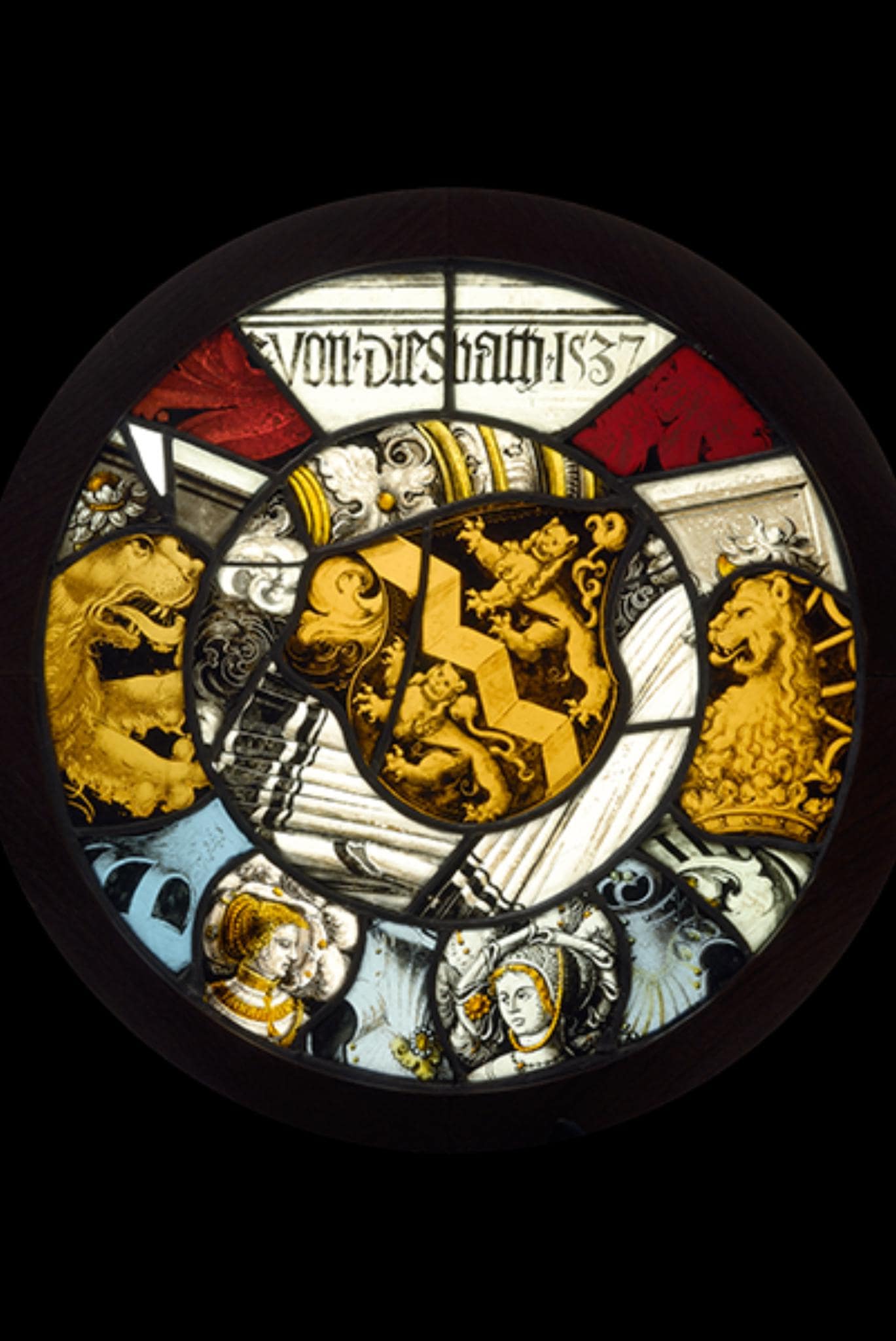 Die aus mehreren Fragmenten komponierte Rundscheibe setzt sich vorwiegend aus Scherben zusammen, die Wappenscheiben der Familie von Diesbach entstammen. Die Mitte nimmt ein Wappenschild von Diesbach ein, rechts davon ist eine Helmzierde des Wappens (Löwe) angebracht und am oberen Bildrand erscheint ein Inschriftenfragment von 1537. Wappenhelmteile, Köpfe zweier Schildbegleiterinnen, Gewandtteile, Ornamentstücke und ein zweiter Löwe ergänzen das Ganze zu einem Rund.