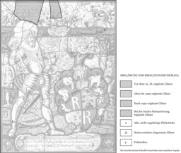 n der Sammlung von Reding in Schwyz befindet sich eine weitgehend analog komponierte, um 1685 entstandene Scheibe Rudolf Redings. Die gleiche Sammlung besitzt von diesem noch eine weitere Scheibe mit der Darstellung Christi im Elend von 1585 (SZ_20, SZ_21, vgl. Meyer 1978, S. 365f., Nrn. 3, 4). Die gleichen Gesichtszüge wie auf vorliegender Scheibe besitzt Oberst Rudolf Reding auf seinem Bildnis von 1594 (Meyer 1978, S. 345, Abb. 355).