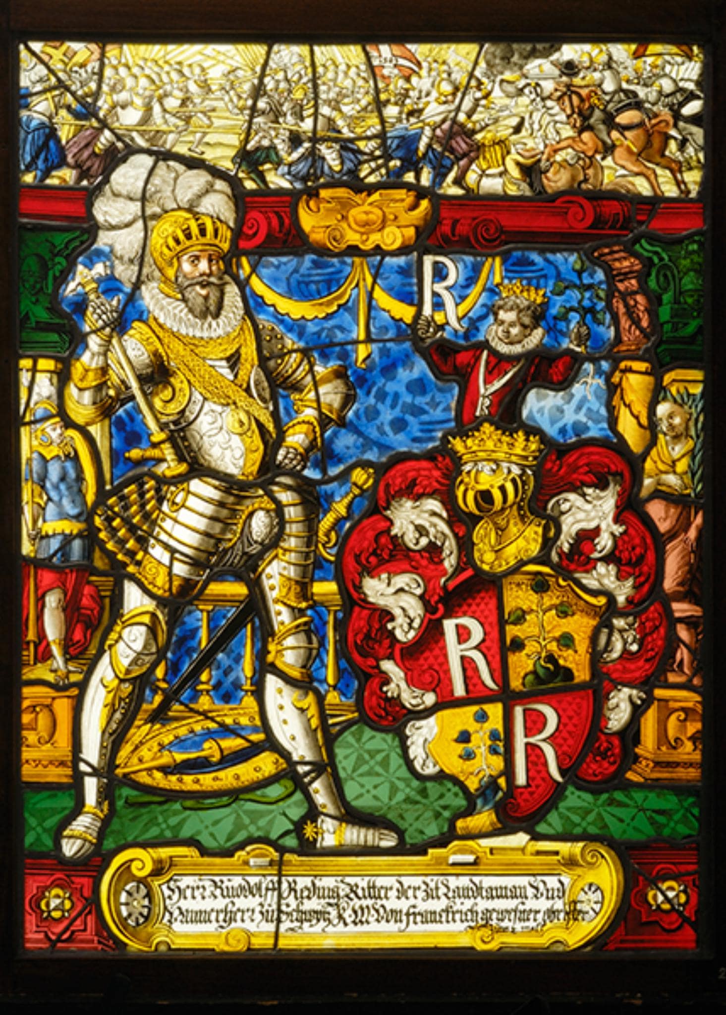 Rudolf Reding (1536–1609) von Schwyz, seit 1559 verheiratet mit Elisabeth In der Halden, war 1558 Leutnant in französischen Diensten, 1562 Hauptmann eines Fähnleins Schwyzer im Regiment Fröhlich, dann im Regiment Tammann und schliesslich im Regiment Pfyffer. 1562 in der Schlacht von Dreux gegen die Hugenotten verwundet, stand aber 1567 bereits wieder als Hauptmann im Regiment Pfyffer in französischen Diensten. 1585–1588 diente er ein weiteres Mal der französischen Krone, diesmal als Oberst und Regimentsinhaber. Reding war Parteigänger und Verfechter der französischen Interessen in der Eidgenossenschaft. Für Schwyz weilte er immer wieder als Abgeordneter an Tagsatzungen. 1584/85, 1592–1594, 1596–1598 und 1606–1608 war er Schwyzer Landammann und 1592–1609 Schwyzer Pannerherr. 1591–1595 begleitete er als Bauherr den Neubau des Rathauses in Schwyz. 1602 nahm er an der Gesandtschaft nach Paris zur Bundeserneuerung mit König Heinrich IV. teil. Er wurde 1585 von König Heinrich III. geadelt und 1594 vom Papst zum Ritter vom Goldenen Sporn geschlagen (HLS 10/2011, S. 163).