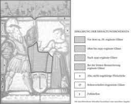 Vor grau-weissem Damastgrund posiert links der bärtige, mit einer goldenen Halskette geschmückte Stifter in rotem Hemd, grünem Wams, gelben Beinkleidern und mit schwarzem Federbarett. Die Rechte in die Hüfte gestützt, hält er in seiner Linken die Halbarte. Begleitet wird er von seiner Gemahlin, die ihm in ihrer Rechten den Willkommenstrunk in einem goldenen Becher präsentiert. Ihre Sonntagstracht besteht aus einem roten Rock über blauem Untergewand, einer weissen Schürze, einem hellblauen Mieder über weissem Hemd mit Mühlsteinkragen, einer schwarzen Haube und dem am Gürtel herabhängenden Besteckbeutel. Das Stifterpaar steht zusammen mit dem Wappenschild des Kaspar Anderegg auf einem schmalen Podium, an dessen Front die Inschrift prangt. Die Figuren rahmen zwei ein Gebälk tragende kannelierte Säulen. Das Oberbild zeigt eine von zwei Männern geführte Kuhherde in einer Gebirgslandschaft.
