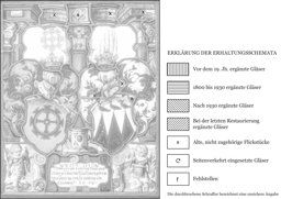 Über der roten, von zwei Engelsknaben gehaltenen Rollwerkkartusche mit der Stifterinschrift erheben sich die Vollwappen des Hans Friedrich von Mülinen und der Margaretha Waldner. Das Podium hinter dieser Kartusche und den Engeln dient als Standplatz für die zweiachsige Rahmenarchitektur vor farblosem Grund. Diese besteht aus zwei grünen seitlichen und einem blauen mittleren Pfeiler, denen rote Säulen vorgesetzt sind. Der darauf ruhende Doppelbogen ist z. T. mit Flickstücken belegt.