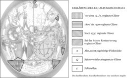 Die Ovalscheibe präsentiert vor farblosem, schnurverziertem Grund die Vollwappen des Rudolf von Erlach und der Katharina von Mülinen. Diese werden von zwei allegorischen Frauengestalten begleitet, die in ihrer einen Hand einen Palmzweig und den Wappenschild halten sowie in der anderen einen Kronreif bzw. ein Tüchlein emporheben. Die beiden in gelber und violetter bzw. blauer und violetter Kleidung dargestellten Schildbegleiterinnen stehen auf dem gelben Podium, dessen Front die engelskopfgeschmückte blaue Rollwerkkartusche mit den Stifternamen ziert. Figuren und Wappen umfasst ein Rahmen aus gelben Rollwerkzargen.