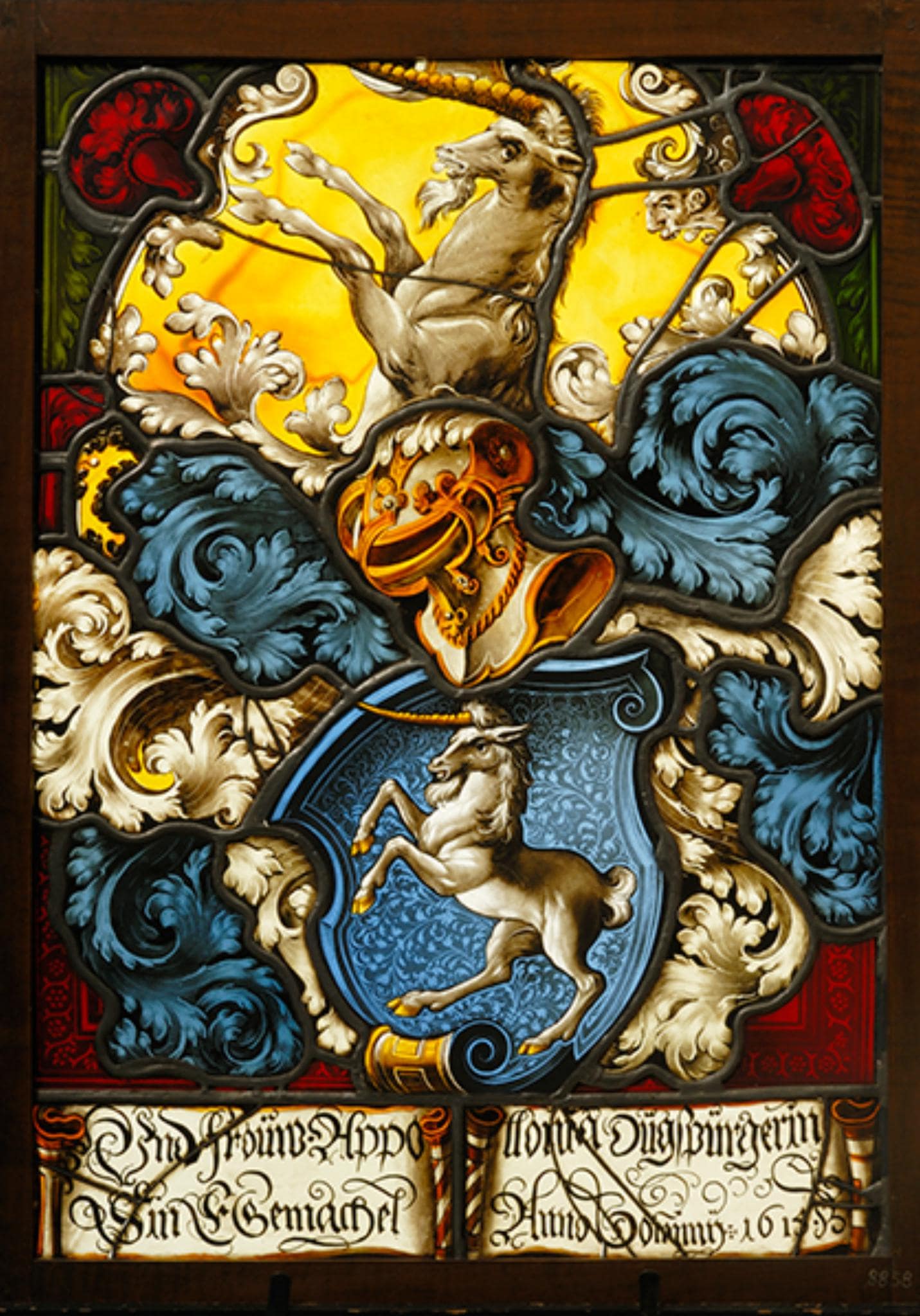 Das Glasgemälde bildet das Pendant zur Wappenscheibe von Apollonia Augsburgers Gemahl Hans Rudolf Sager (BHM Bern, Inv. 8857). Wer die beiden Scheiben schuf, ist unbekannt.