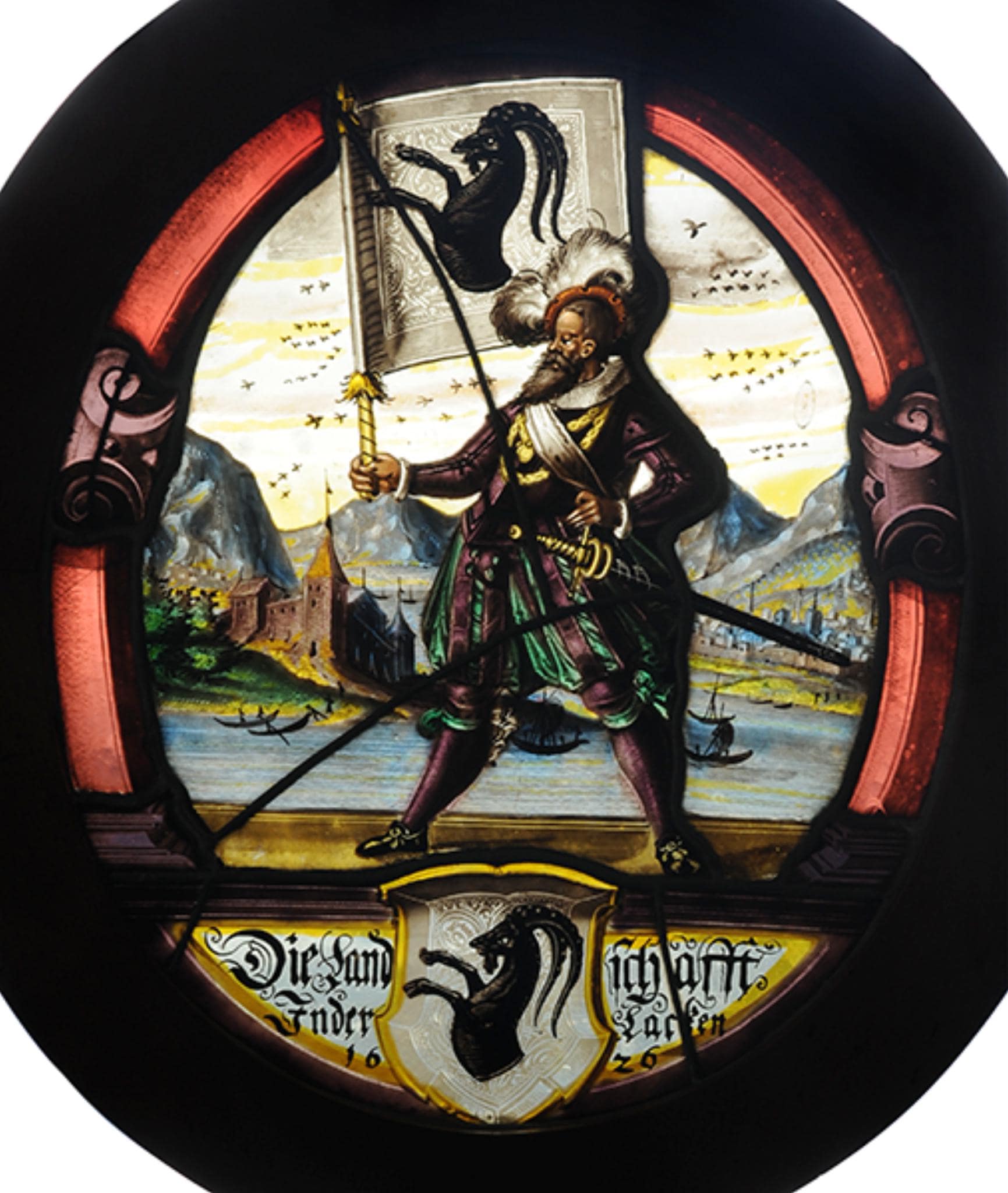 Das Glasgemälde der Landschaft Interlaken gehört zu einer Gruppe von fünf in den Massen übereinstimmenden (ca. 23 x 20 cm) Ovalscheiben aus den Jahren 1626/27. Dazu zählen ausser der Stiftung Interlakens die Scheiben des dortigen Landvogts Beat Fischer im Schloss Jegenstorf (Inv. 77), des Thuner Schultheissen Johann Frischherz im Bernischen Historischen Museum (BHM Bern, Inv. 33654), des Interlakener Landschreibers Hans Rudolf Graffenried (Kat. Stuker 1978, Nr. 3020; davon aquarellierte Zeichnung im Album Emanuel Edmund von Graffenrieds im BHM Bern, Inv. 6202.14, und Pause Johann Heinrich Müllers im SNM Zürich, Inv. LM 24498) sowie diejenige des Klosterammans zu Oberhofen Melchior Ritschard von 1626, die 1975 aus dem Schlossmuseum Thun entwendet wurde (Inv. 475; Mus. Thun, Fotos 475, 6810). Die fünf genannten Glasgemälde waren zweifellos für den gleichen Ort bestimmt und aufgrund ihrer Stifter muss es sich dabei um einen Bau in der Thunerseeregion gehandelt haben. Zu denken hat man dabei in erster Linie an das Klösterli in Oberhofen, das unter der Leitung des dortigen Ammanns Melchior Ritschard 1626/27 neu errichtet wurde. Dieses Klösterli, das ehemalige Herbsthaus (Rebhaus) der Interlakener Klosterreben, gehörte seit der Reformation zur gleichnamigen Landvogtei. Es dient seit 1983 als Kirchgemeindehaus (HLS 9/2010, S. 326f.).