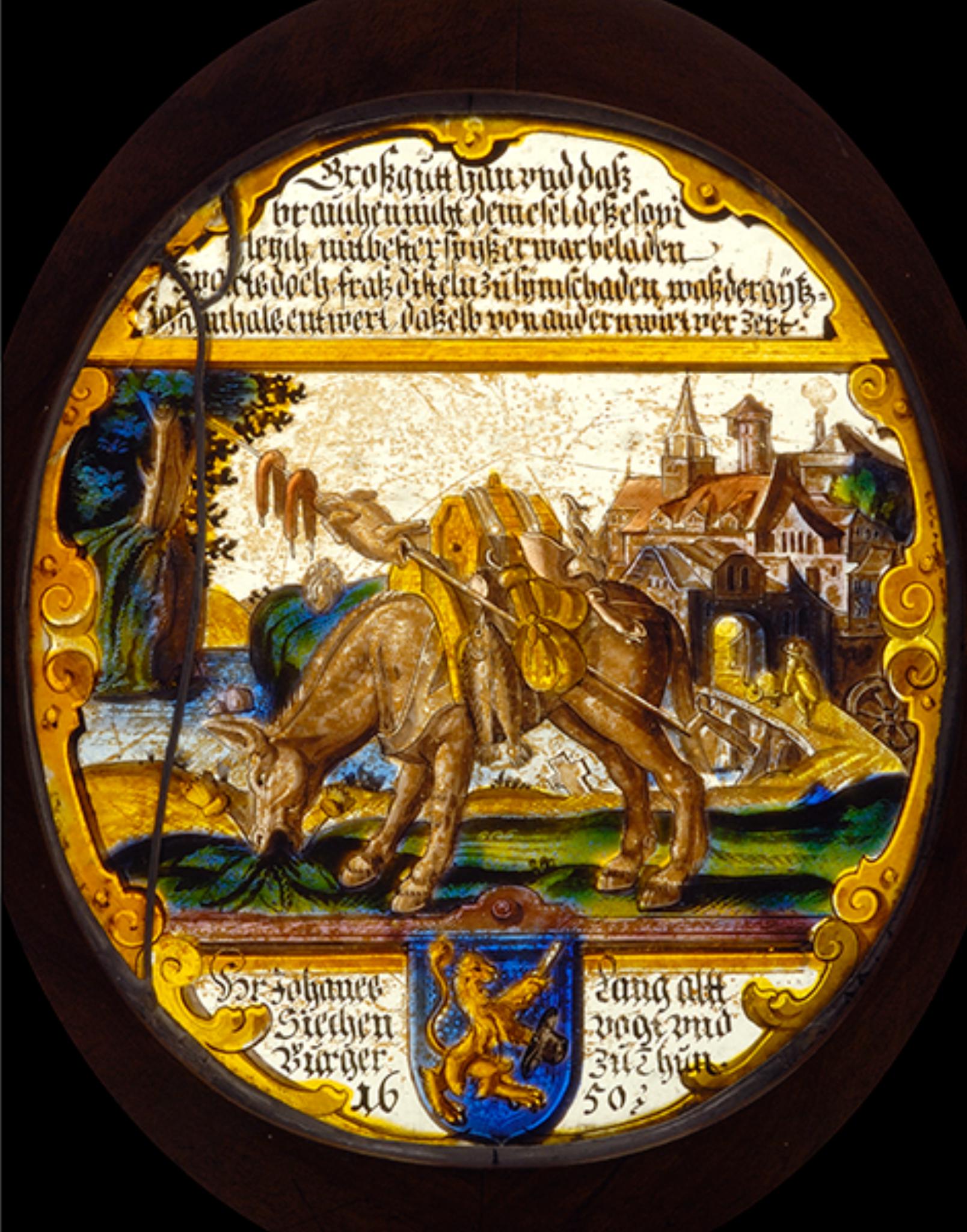 Die Ovalscheibe stellt in ihrem Zentrum eine Fabel des Aesop dar, welche den Geiz versinnbildlicht: ein reich mit Esswaren beladener Esel frisst am Flussufer bei einer Stadt Disteln im Gras. Über der Darstellung ist in einer Kartusche die mehrzeilige Bildlegende eingeschrieben, im unteren abgetrennten Teil steht der Name des Stifters mit dessen Wappen. Die ganze Komposition umfasst eine schmale, mit Rollwerk verzierte gelbe Bordüre.