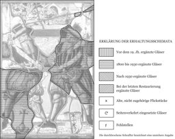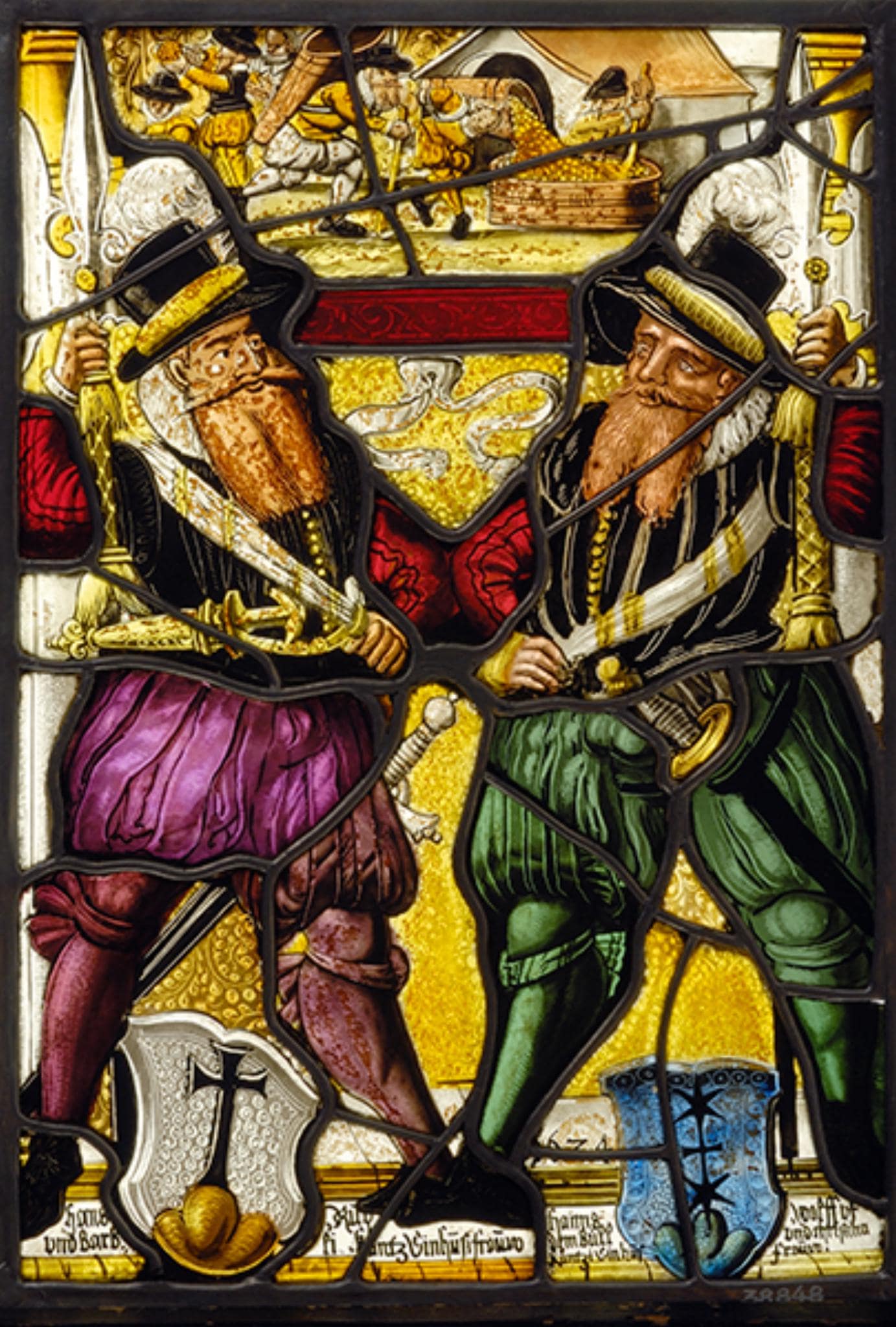 Die Figurenscheibe zeigt die zwei bärtigen, schwertbewaffneten Stifter ohne festen Standplatz, sind doch diese vor dem gelben Damastgrund nicht auf das niedrige Podium, sondern mit ihrem Wappen zwischen den Füssen "schwebend" davor gesetzt. Die beiden Männer sind gegengleich gestaltet, d. h. sie halten in der einen Hand ihre Halbarte, während sie die andere angewinkelt an die Hüfte stemmen. Sie erscheinen auch in gleicher Kostümierung. Diese besteht aus einem roten Hemd mit bauschigen Ärmeln, einem schwarzen Wams und Federhut sowie Pluderhosen und Strümpfen. Bei Hans Rupp, der zusätzlich einen Schweizerdolch am Gürtel trägt, sind die Beinkleider allerdings in violetter und bei seinem Kollegen in grüner Farbe. Hinter ihnen erhebt sich eine schlichte Rahmenarchitektur aus zwei weissen Stützen und einem roten Gebälk. Das Oberbild in Grisaille- und Silbergelbmalerei schildert, wie Weinbauern im Rebberg Trauben lesen und ihre Ernte ins Fass zum Keltern schütten.