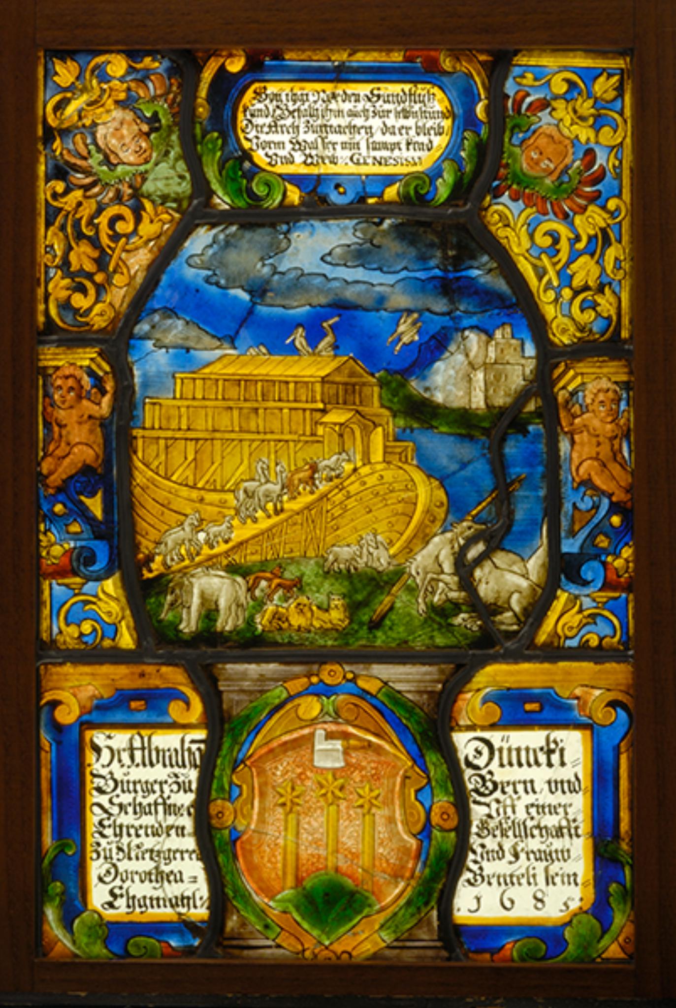 Im Scheibenzentrum festgehalten ist die am Ufer verankerte Arche von Noah, in welche die vom Lande her kommenden Tiere einsteigen. Das Hauptbild rahmen seitlich zwei blaue Rollwerkkonsolen, worin je ein Putto sitzt. Darüber erhebt sich ein mit zwei geflügelten Engelsköpfen geschmückter Bogen aus Rankenwerk, dessen Scheitel die Rollwerkkartusche mit der Bildlegende ziert. Eine weitere solche Kartusche füllt die hohe Sockelzone. Ihr zentral aufgesetzt ist das oval umkränzte Wappen von Abraham Dünki.