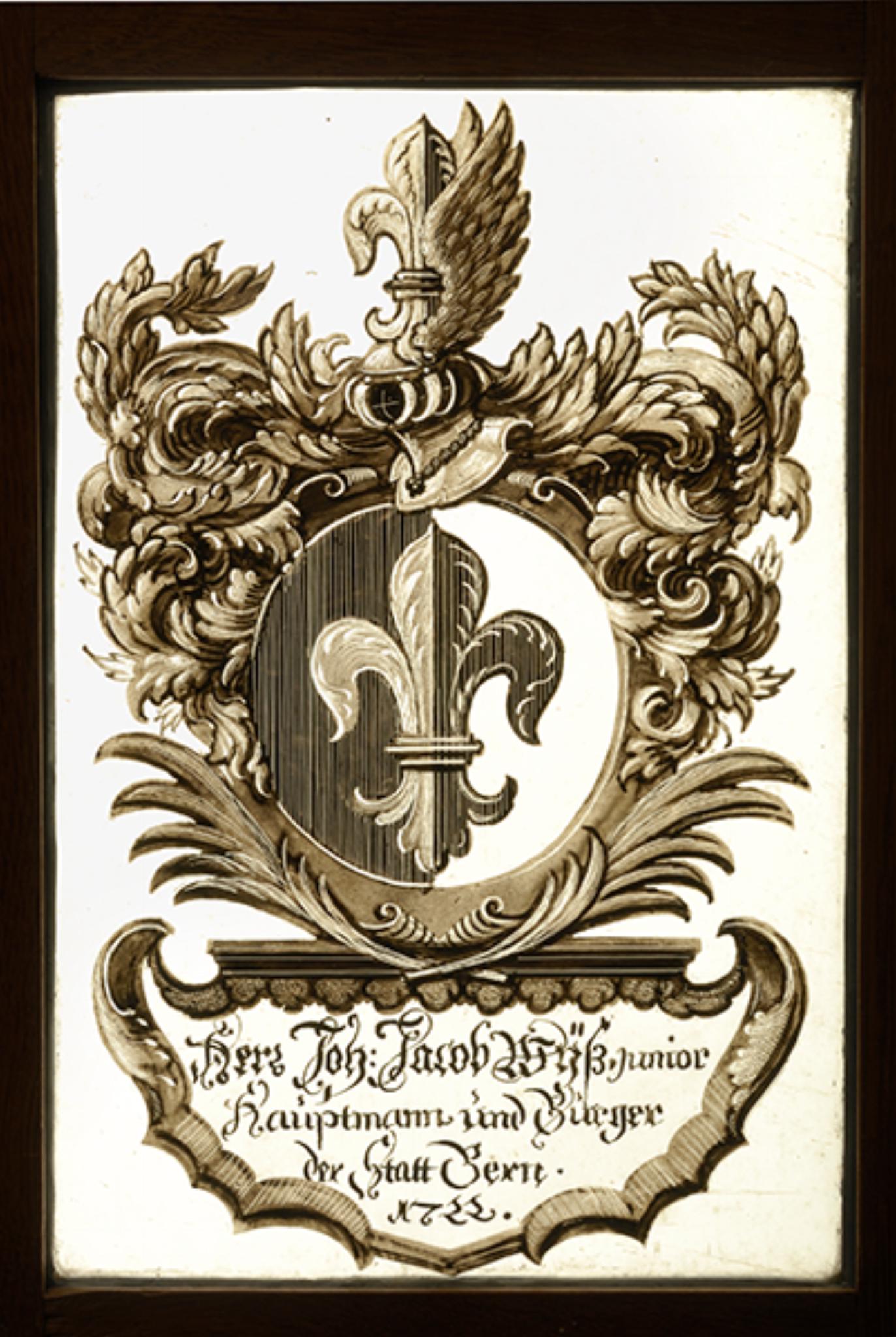 Die Identifizierung des Hauptmanns Johann Jakob Wyss erweist sich als schwierig. Der als "junior" bezeichnete Scheibenstifter ist vielleicht gleichzusetzen mit Hans Jakob Wyss (16.3.1677–1743), Sohn des Hans Jakob (1647–1706) und der Barbara von Graffenried. Dieser diente als Oberstleutnant in kaiserlichen Diensten im Regiment Schmid und in Bern als Siechenvogt. Seine Ehefrau war Elisabeth Otth, Tochter des Andreas Otth und der Katharina Berseth. Sein Vater war jedoch 1722 schon längere Zeit verstorben, so dass sich bei ihm der Zusatz "junior" erübrigen würde. Hans Jakob besass jedoch auch einen jüngeren Bruder Johann Jakob (* 12.12.1679), von dem nichts Weiteres bekannt ist. Ein weiterer, zeitlich in Frage kommender Johann Jakob Wyss (30.7.1689–1749) war Sohn des Hans Franz und der Euphrosina Wyss und mit Anna Maria Stuber (1683–1758) verheiratet. Er diente als Oberstleutnant und war Gutsbesitzer in Rüfenacht. Doch auch er dürfte nicht als "junior" gelten (Kessel 2016).
