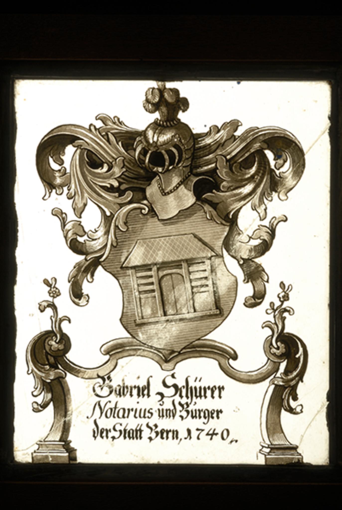 Schürers Wappenscheibe gehört sicher zur gleichen Serie wie die Grisaillescheibe Daniel Fueters von 1740 im Bernischen Historischen Museum (BHM Bern, Inv. 7710). Aus dem gleichen Zusammenhang stammt möglicherweise auch die in einer Zeichnung überlieferte, von Samuel Küpfer signierte Grisaillescheibe von Graffenried von 1740 (farbige Zeichnung im Album des Emanuel Edmund von Graffenried [1829–1881] im BHM Bern, Inv. 6202.31). Die Scheibe Gabriel Schürers wird daher ebenfalls diesem Berner Glasmaler zuzuschreiben sein.