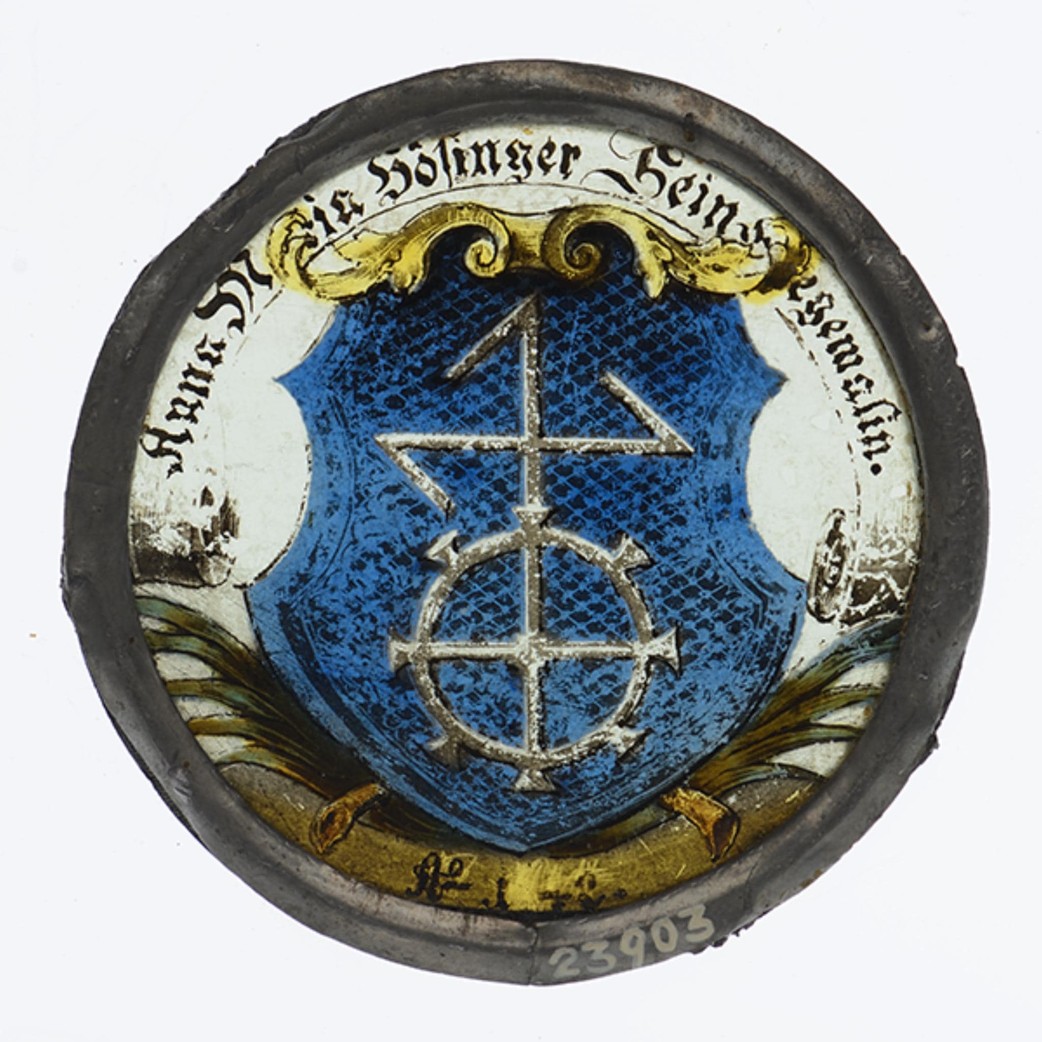Über zwei Palmwedeln steht das Wappen der Anna Mia (Maria?) Hösinge) vor farblosem Grund. Darüber nennt eine randständige Schriftrolle den Namen der Stifterin. Am unteren Rand ist das stellenweise ausgekratzte Datum angebracht.