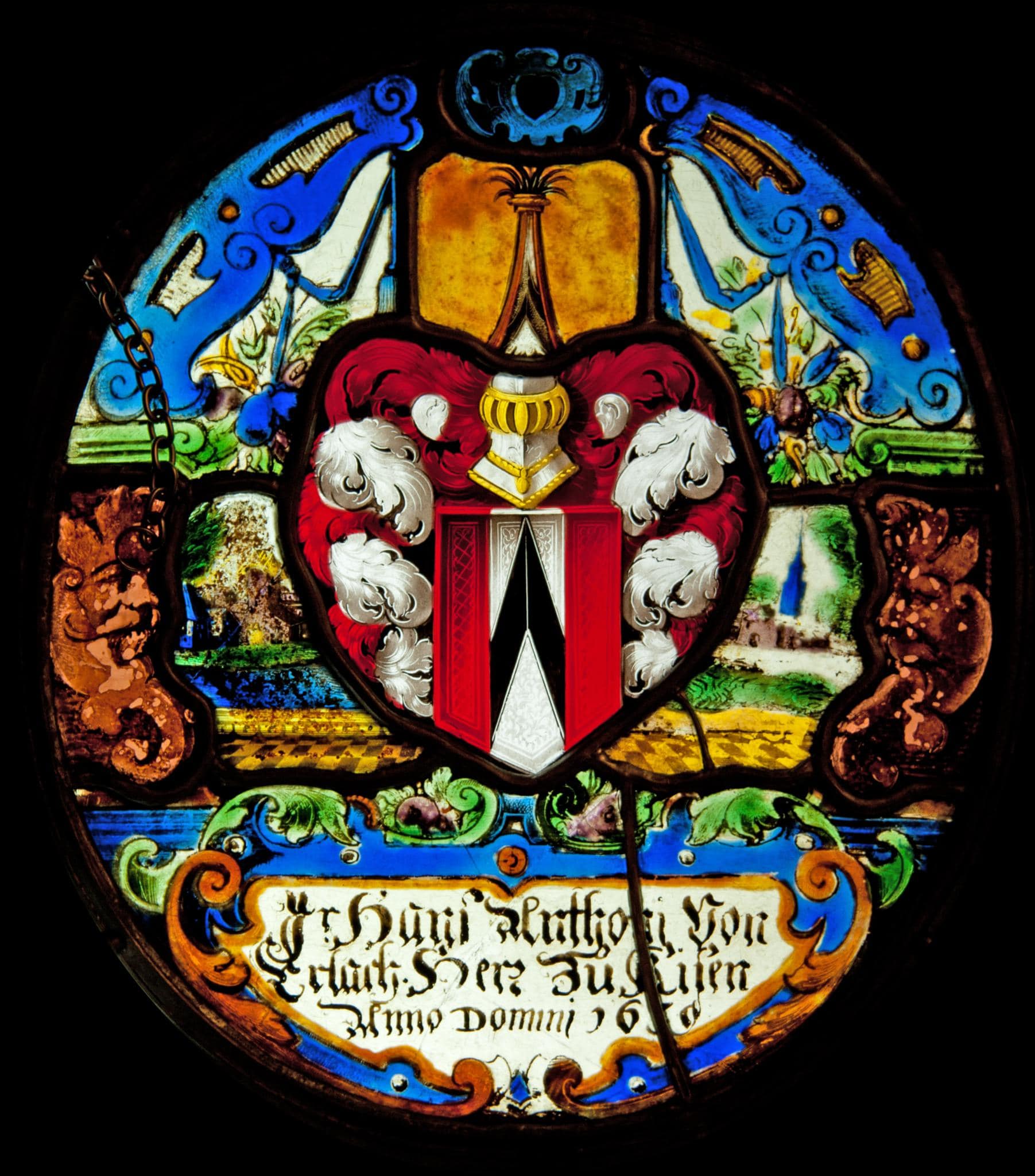Die Stiftung von Erlachs bildet das Pendant zu der gleichfalls im Von-Wattenwyl-Haus befindlichen Ovalscheibe Bernhard von Wattenwyls (Inv. vW 158). Beim Glasgemälde von Wattenwyls wird die Jahreszahl unterschiedlich gelesen. So glaubt Conrad von Mandach in deren durch das Blei teilweise verdeckten dritten Ziffer eine "5" erkennen zu können. Bei ihr muss es sich aber um eine "3" handeln. Die letzte Ziffer hinwiederum wird einerseits als "0" und andererseits als "6" gelesen (von Mandach, Cetto/Hofer bzw. Heinz Matile, in: Kartei Stifter, Bernisches Historisches Museum). Bei der Scheibe Hans Anton von Erlachs interpretiert Matile diese Ziffer hingegen als "9". Diesbezüglich ist festzuhalten, dass die beiden Glasgemälde sicher für denselben (unbekannten) Bestimmungsort zur gleichen Zeit entstanden, und zwar entweder 1630 oder 1639. Obwohl bei der Scheibe des 1608 geborenen Bernhard von Wattenwyl die letzte Ziffer der Jahreszahl im heutigen Zustand eher als eine "0" denn eine "9" erscheint, wird derselbe seine Wappenstiftung kaum bereits im Alter von 22 Jahren, sondern als 31jähriger gemacht haben. Die betreffende Ziffer dürfte demnach eine "9" sein, deren schwungvoll nach unten gezogene Linie verbräunt (Scheibe von Wattenwyl) beziehungsweise sehr dünn geraten ist (Scheibe von Erlach).