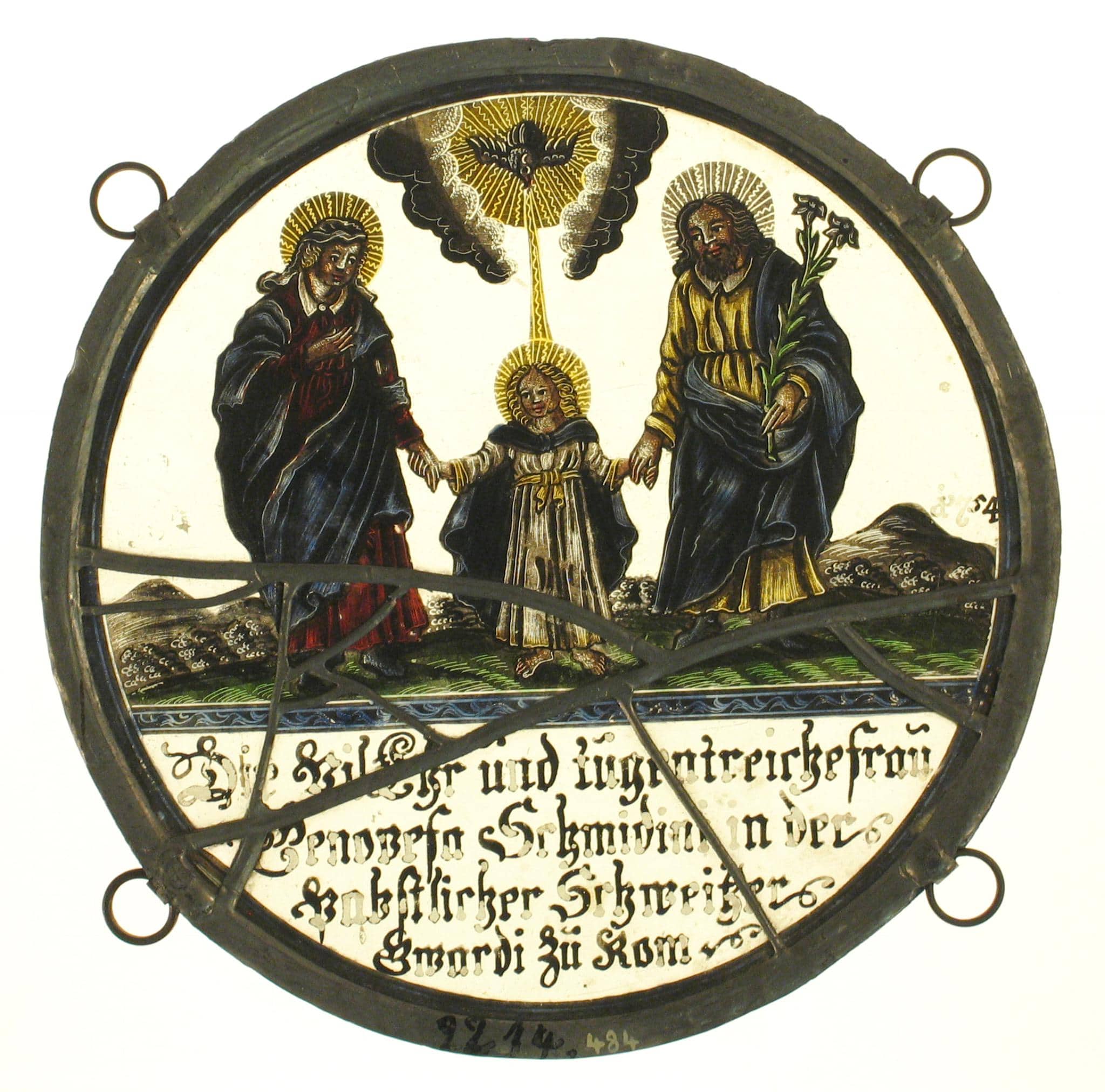 Die Scheibe zeigt den zwischen Maria und Josef stehenden Jesusknaben. Von ihnen an der Hand geführt, empfängt er von der über ihm schwebenden Taube des Heiligen Geistes den göttlichen Strahl. Die heilige Familie ist vor farblosem Grund in eine kahle Landschaft gesetzt. Das untere Scheibendrittel füllt die Stifterinschrift.