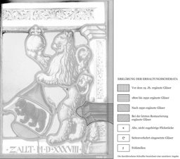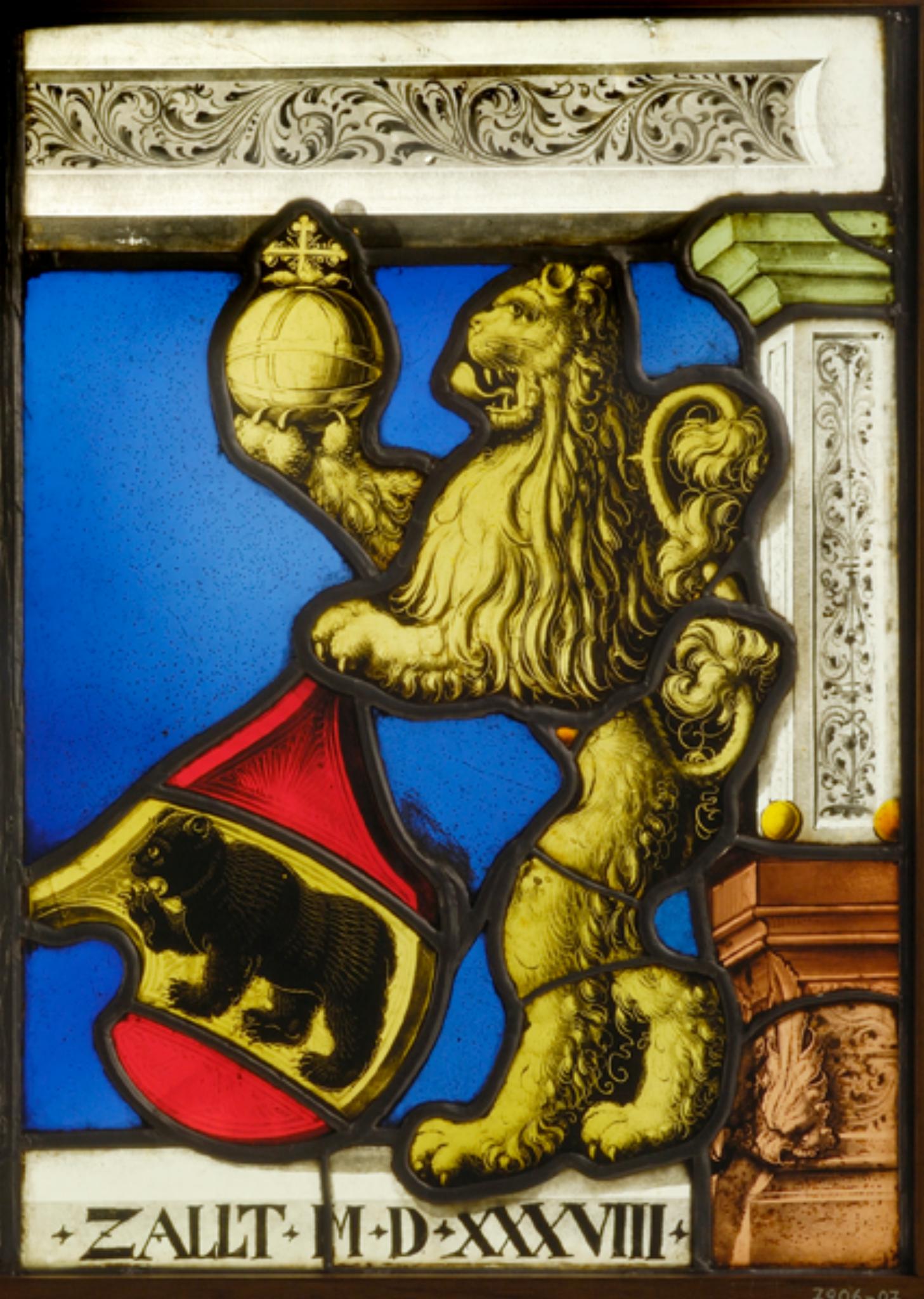 Vor blauem, ungemustertem Grund steht das seinem Gegenstück zugeneigte Berner Hoheitszeichen. Es wird von einem auf dem beschrifteten Podium stehenden Löwen gehalten, der in seiner freien Vorderpranke den Reichsapfel emporhält. Der auf einem hellrosa Postament ruhende Rahmenpfeiler ist ebenso wie das darauf gesetzte Gebälk mit einem schwarzen Arabeskenfries geschmückt. Die Scheibe bildet den rechten Teil einer Doppelstiftung.