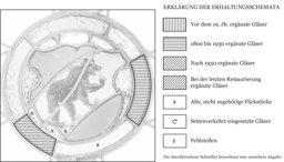 Zwei neue Ergänzungen in der Bordüre; alte Flickstücke in Bordüre und Damast; die Schwarzlotbemalung stellenweise stark beschädigt; ein Sprung und Sprungbleie; die Verbleiung erneuert.