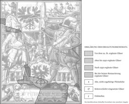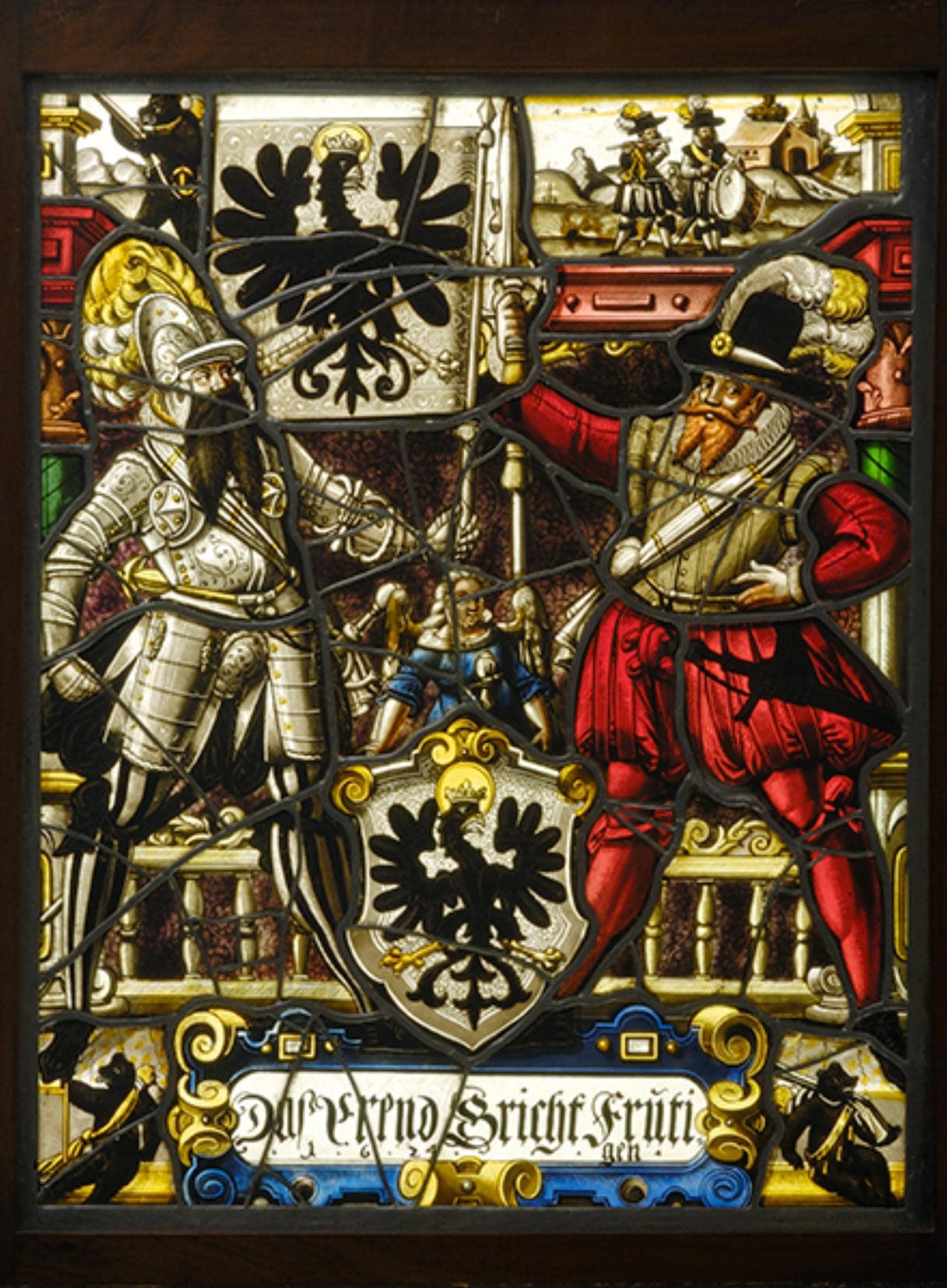 Vor violett-schwarzem Damastgrund und einer Balustrade begleiten der Frutiger Venner und ein Krieger mit Lanze das von einem Engel gehaltene Wappen der Landschaft Frutigen. Der mit Schwert und Schweizerdolch ausgerüstete Schildwächter links trägt einen Halbharnisch sowie schwarz-weiss gestreifte Strümpfe. Das von ihm in der ausgestreckten Linken empor gehaltene Banner zeigt im weissen Feld einen gekrönten und nimbierten einköpfigen Adler. Sein schwertbewaffneter Kollege erscheint in roter Kleidung und hellbraunem Wams. Hinter ihnen erhebt sich auf Säulen ein rotes Gebälk. Darüber sind in einer Landschaft ein Bär mit Büchse sowie ein Trommler und Pfeifer dargestellt. Den Scheibenfuss füllt die von zwei sitzenden Bären flankierte blau-gelbe Rollwerkkartusche mit der Stifterinschrift.