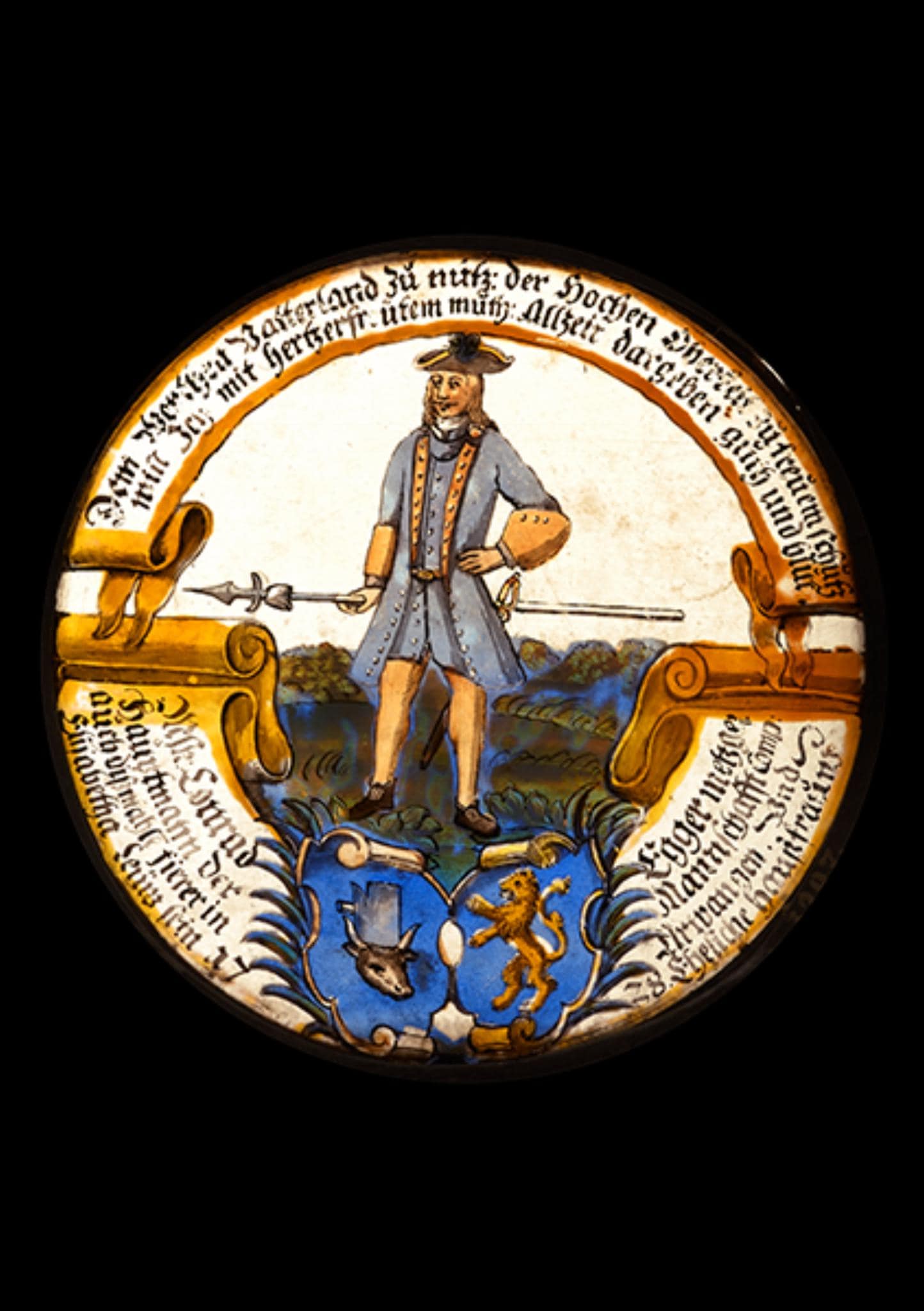 Die monolithe Rundscheibe stellt das Bild des Stifters ins Zentrum. Dieser steht in Hauptmannskostüm vor farblosem Grund in einem grünen Wiesenfeld. Während er mit seiner angewinkelten Linken an die Hüfte greift, hält er in der Rechten einen Spiess. Das Figurenbild umfassen zwei Schriftbänder. Davon sind dem Unteren die umkränzten Wappen des Stifters und seiner Gemahlin zentral aufgesetzt.