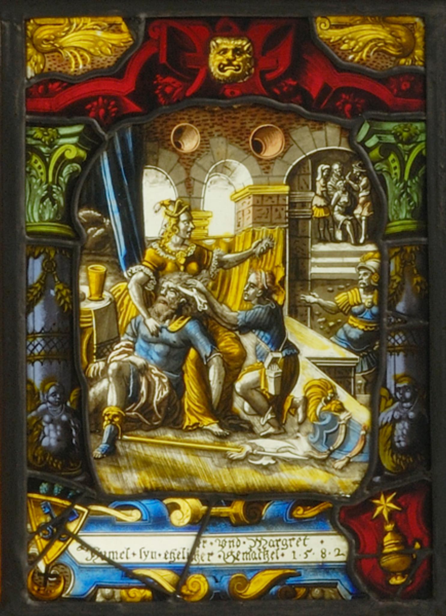 Die Innenraumszene zeigt Simson schlafend im Schosse von Dalila, die diesem mit Unterstützung ihrer Dienerin die Haare abschneidet. Im Hintergrund ist in einem weiteren Raum als Folgeszene die Blendung des gefesselten Simson dargestellt. Das Simson gewidmete Figurenbild (Ri 16, 4–21) rahmt eine Arkade aus hermengeschmückten hellvioletten Säulen mit grünen Kapitellen und einem roten Volutenbogen mit gelber Löwenmaske im Scheitel. Am Scheibenfuss steht in einer blau-gelben Rollwerkkartusche die Stifterinschrift. Die Kartusche flankieren die Wappenschilde des Stifterpaares.