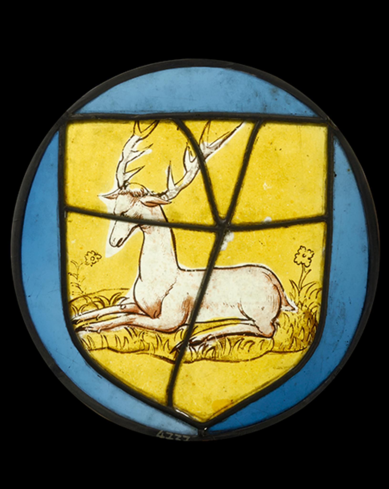 Das Fragment zeigt ein unbekanntes Wappen mit liegendem Hirsch.