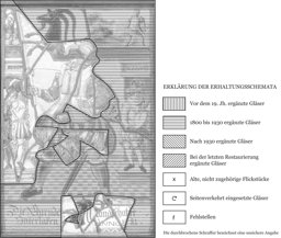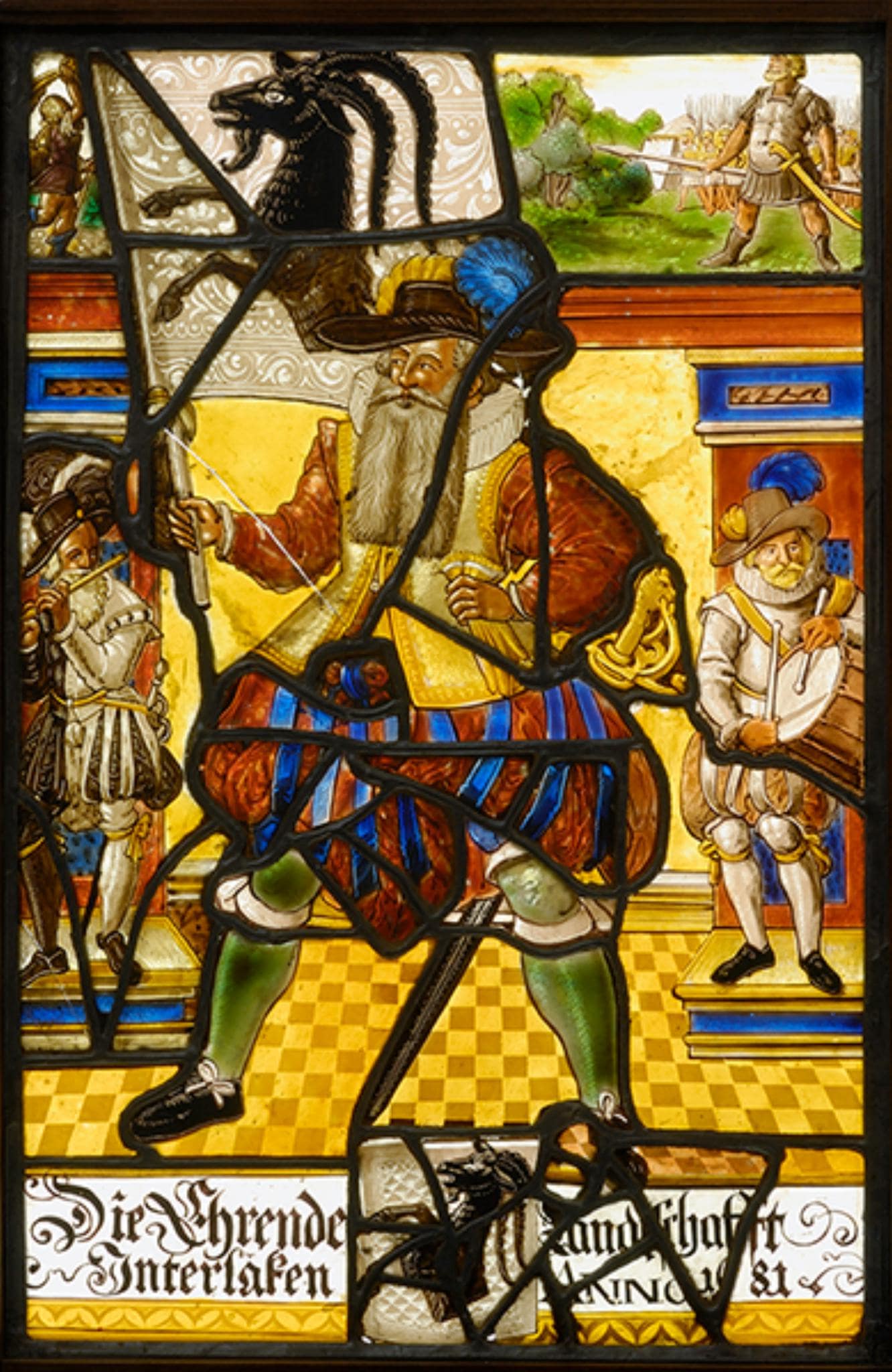 Die Scheibe wird durch die wuchtige Gestalt des Venners von Interlaken dominiert. Breitbeinig vor gelbem Grund auf braun und gelb gefliestem Boden stehend, hält dieser in seiner Rechten das Banner Interlakens und in der Linken seine Handschuhe. Er ist in blau und rot gestreifte Pluderhosen, grüne Strümpfe, ein rotes Hemd und ein gelbes Wams gekleidet und trägt einen schwarzen Federhut. Zu beiden Seiten von ihm erheben sich zwei ein rotes Gebälk tragende blau-rote Pfeiler, vor denen ein Pfeifer bzw. Trommler (Ergänzung) postiert sind. Im Oberbild ist Davids Kampf gegen Goliath (Goliath = Ergänzung) festgehalten (1 Sam, 17, 49f.). Die Stifterinschrift (teilweise ergänzt) und das stark beschädigte Stifterwappen befinden sich unten am Podium.