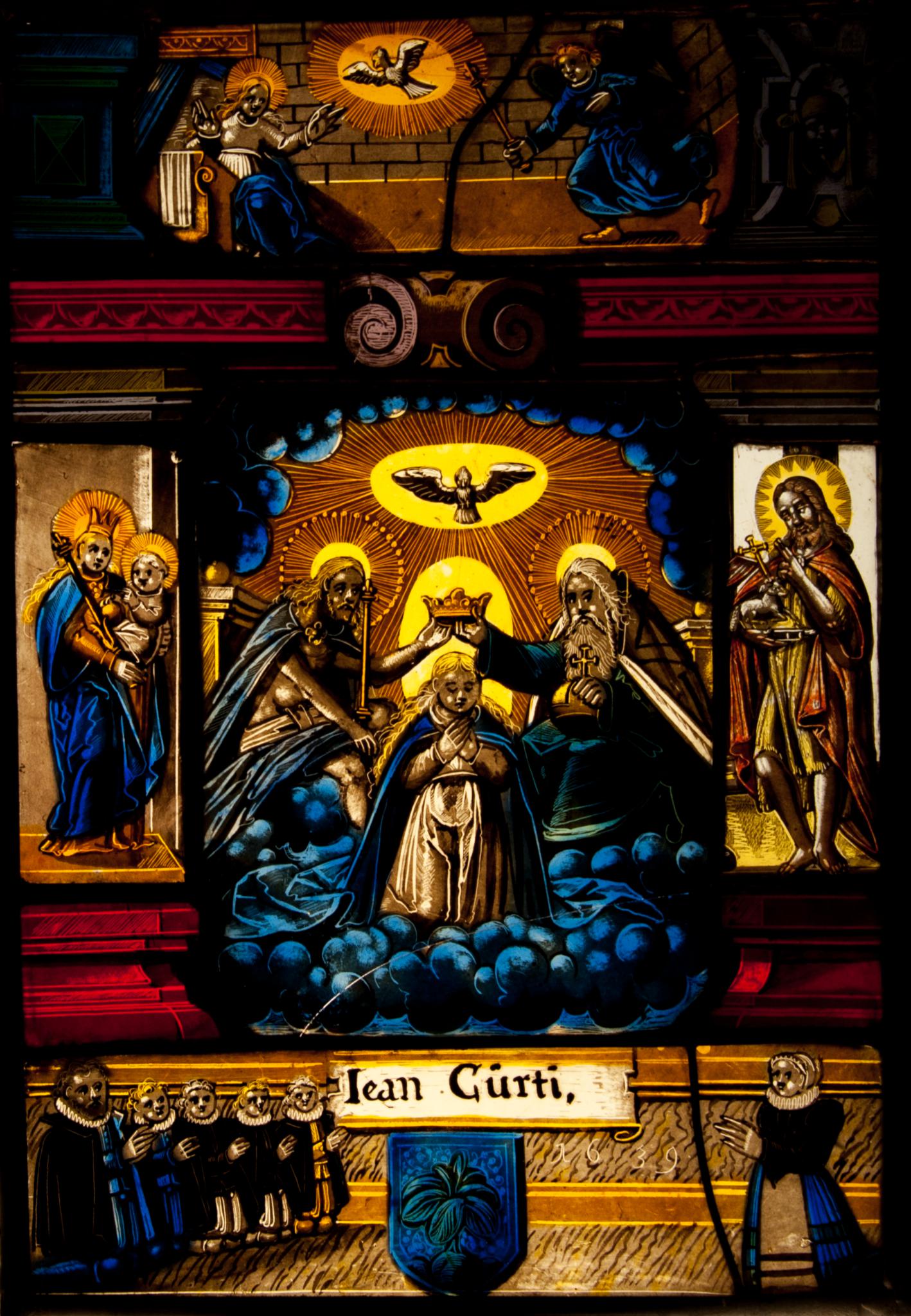 Das Mittelbild zeigt die Gottesmutter, die in andachtsvoller Haltung im blauen Wolkenkranz niederkniet, um sich von den neben ihr thronenden Figuren Gottvaters und Christi im Beisein der über ihr schwebenden Taube des Heiligen Geistes krönen zu lassen. Zu Seiten der Mittelgruppe erscheinen links Maria mit dem Jesusknaben in den Armen sowie rechts Johannes der Täufer mit dem Lamm. Von diesen beiden Figuren gehört lediglich die Himmelskönigin zum Originalbestand der Scheibe (s. u.). Die Mittelzone bedeckt ein rotes Gebälk mit zentralem Rollwerkschmuck. Im Oberbild darüber ist die Verkündigung an Maria festgehalten. Vor dem die Rahmenarchitektur tragenden Podium ist die Familie des Stifters kniend um dessen Wappenschild versammelt. Links befinden sich Jean Curty und seine vier Söhne sowie rechts seine Gemahlin.