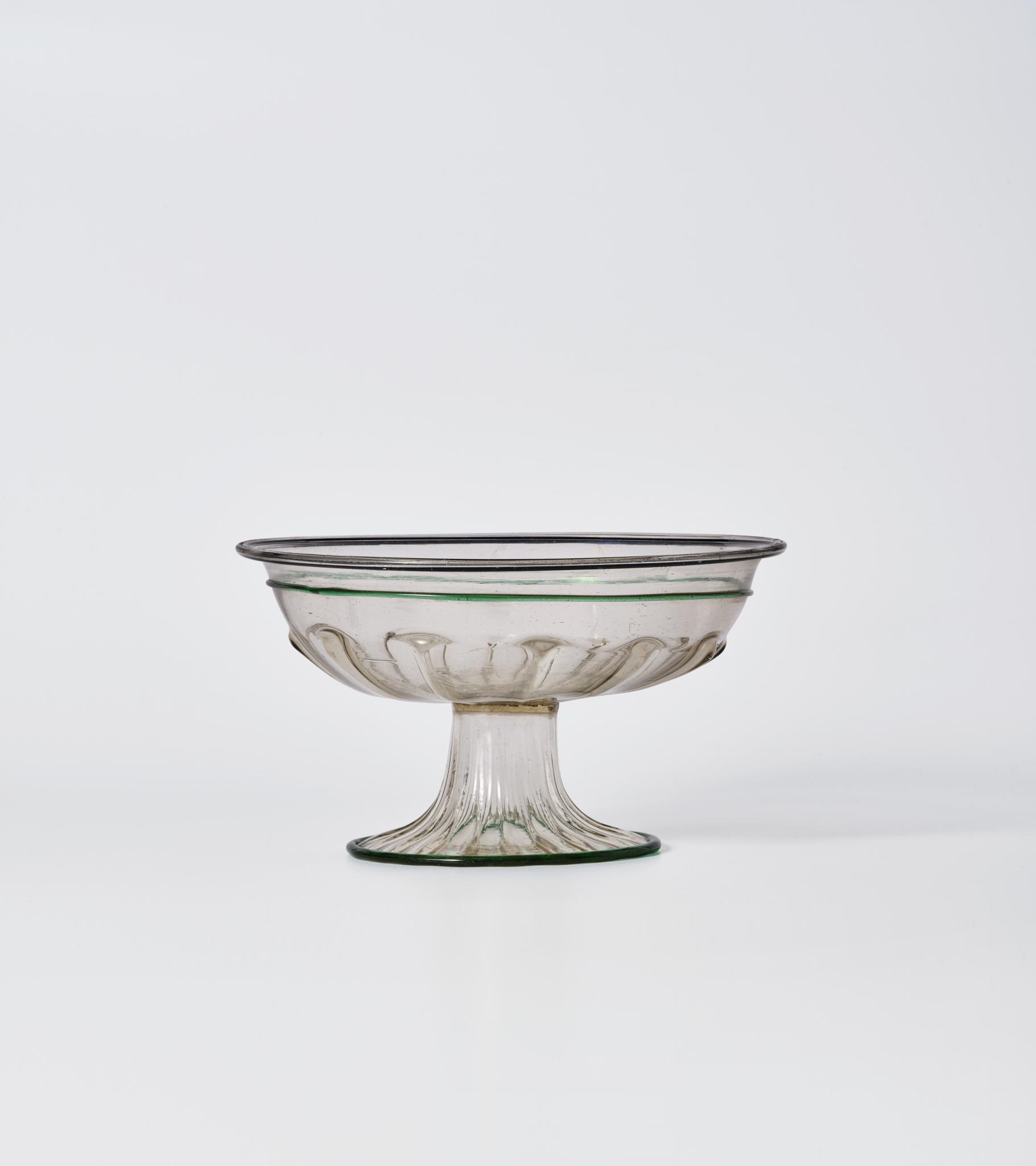 Fussschalen sind die am häufigsten erhaltenen venezianischen Gläser des späten 15. und des beginnenden 16. Jahrhunderts, vor allem in der relativ einfachen Ausführung ohne Dekor, der Gold und Email kombiniert. Es gibt zahlreiche Stücke, die wie das vorliegende oberhalb der radialen oder wirbelförmigen Rippen der Schale horizontale Fäden und eine glatte Goldborte aufweisen; diese ist aber oft so stark berieben, dass sie kaum mehr wahrgenommen wird.