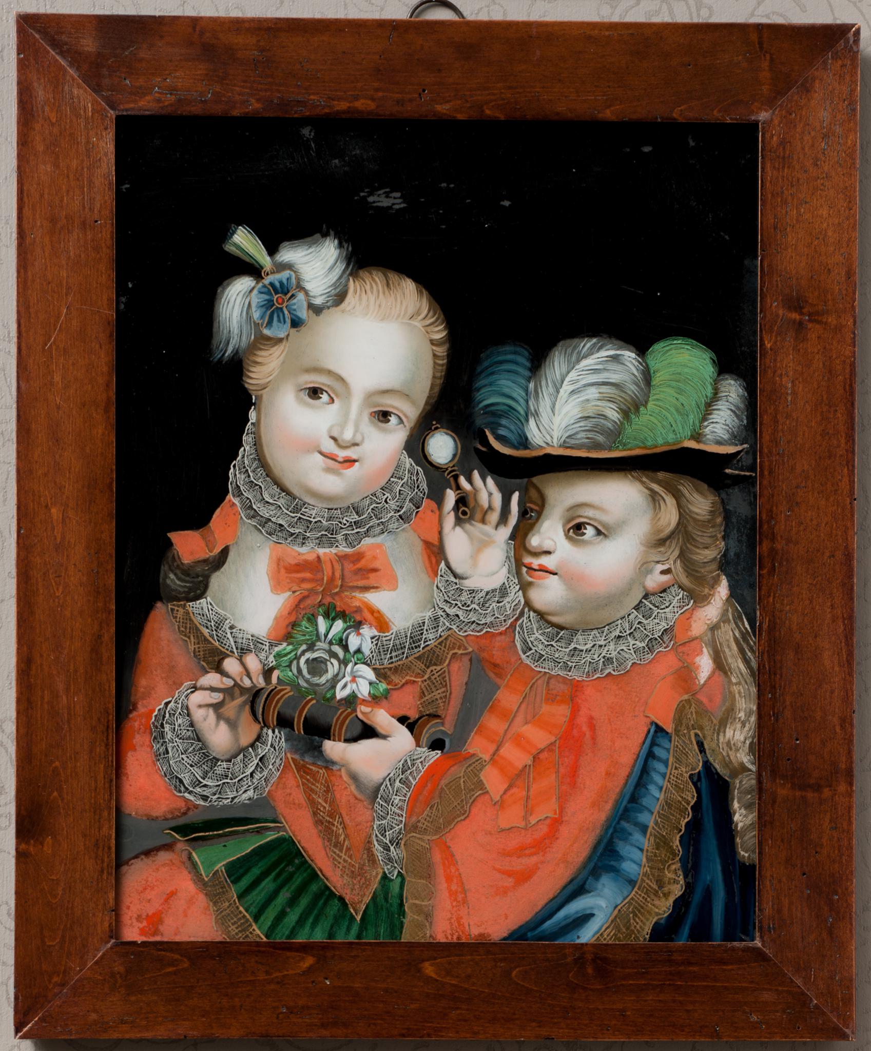 Die Dreiviertelbüsten eines Kinderpaars in modischer Zeittracht stellen eine "Allegorie des Gesichts" dar, die bestimmt einer Bilderserie mit der "Allegorie der fünf Sinne" entstammt. Vor dunklem Hintergrund hat links ein blondes Mädchen mit einem kunstvollen Blumengesteck im Haar einem Knaben ein Fernrohr überreicht. Sie ist frontal wiedergegeben und im Begriff, mit ihrer Klapp-Brille in der linken Hand den Betrachter genauer unter die Lupe zu nehmen. Der Junge im Dreiviertelprofil rechts trägt über langem gezopftem Blondhaar einen mit blauen, weissen und grünen Federn geschmückten Hut. Die beiden pausbäckigen, noch kindhaften Personen stecken in reich mit silberfarbenen Spitzen und goldfarbenen Borten besetzten Kleidern, die der Erwachsenenmode entsprechen.