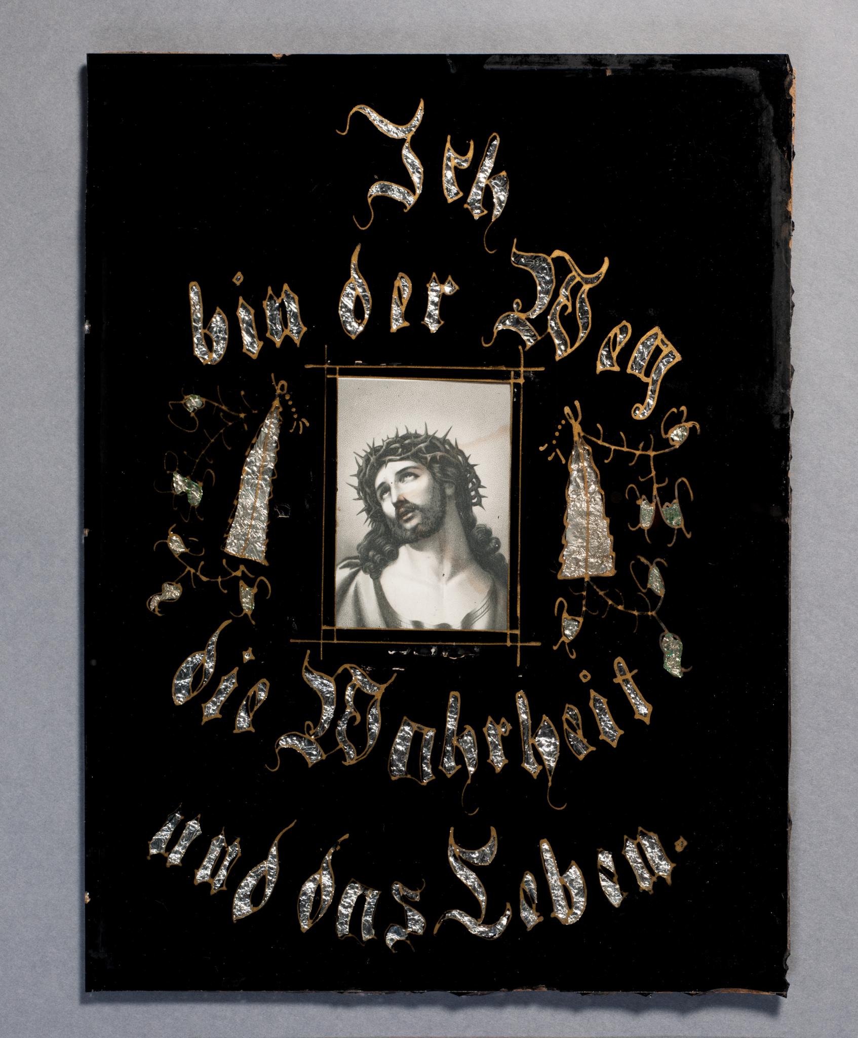 Schwarz grundiertes Schriften-Eglomisé mit hinterlegter Lithographie, die Christus als Ecce Homo im Brustbild darstellt. Die Beschriftung ist mit geknittertem Silberstanniol hinterlegt und mit gelber Farbe umrandet.